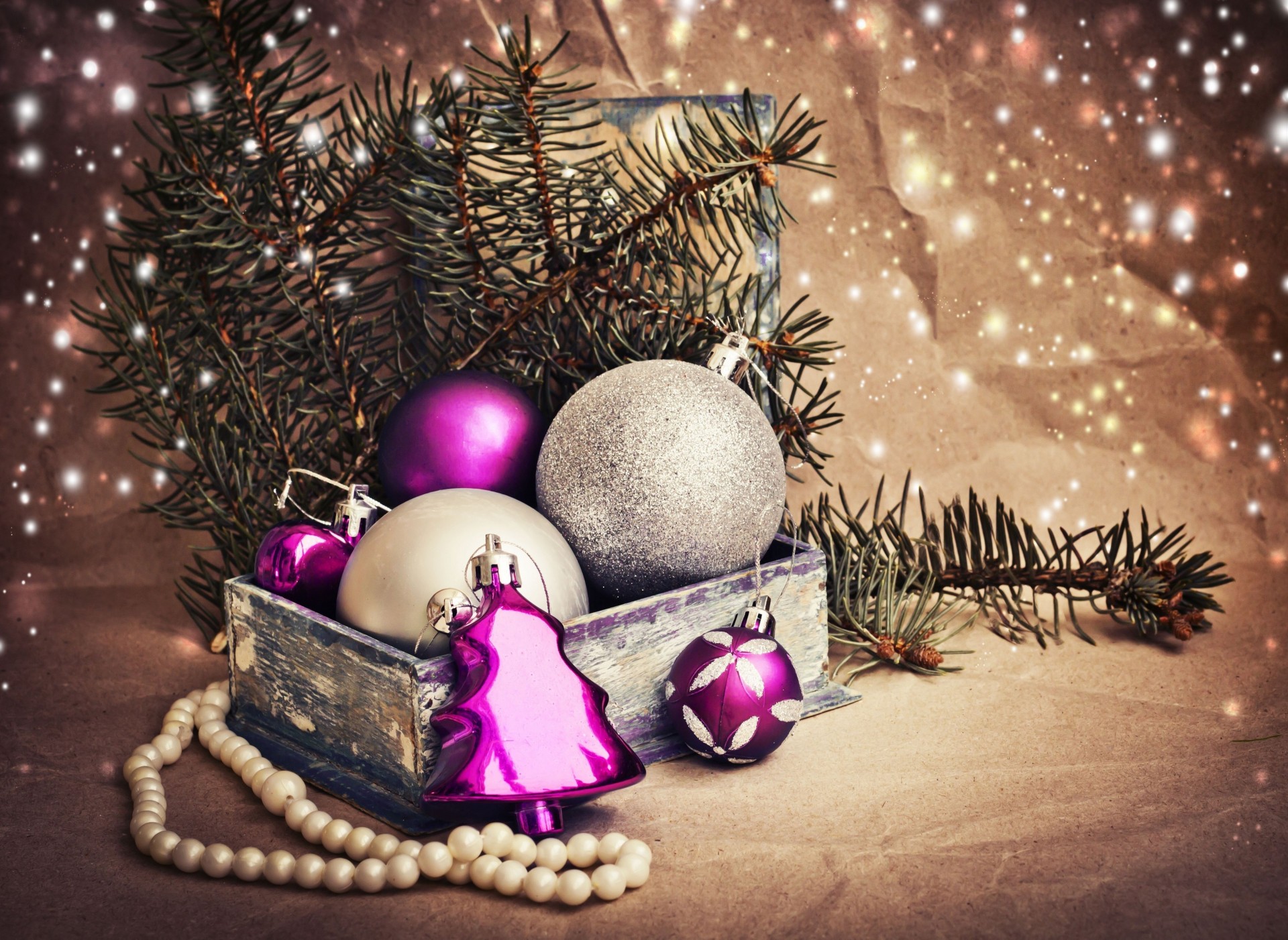 Bunte Weihnachtskugeln, die in einer Reihe auf Tannenzweigen liegen