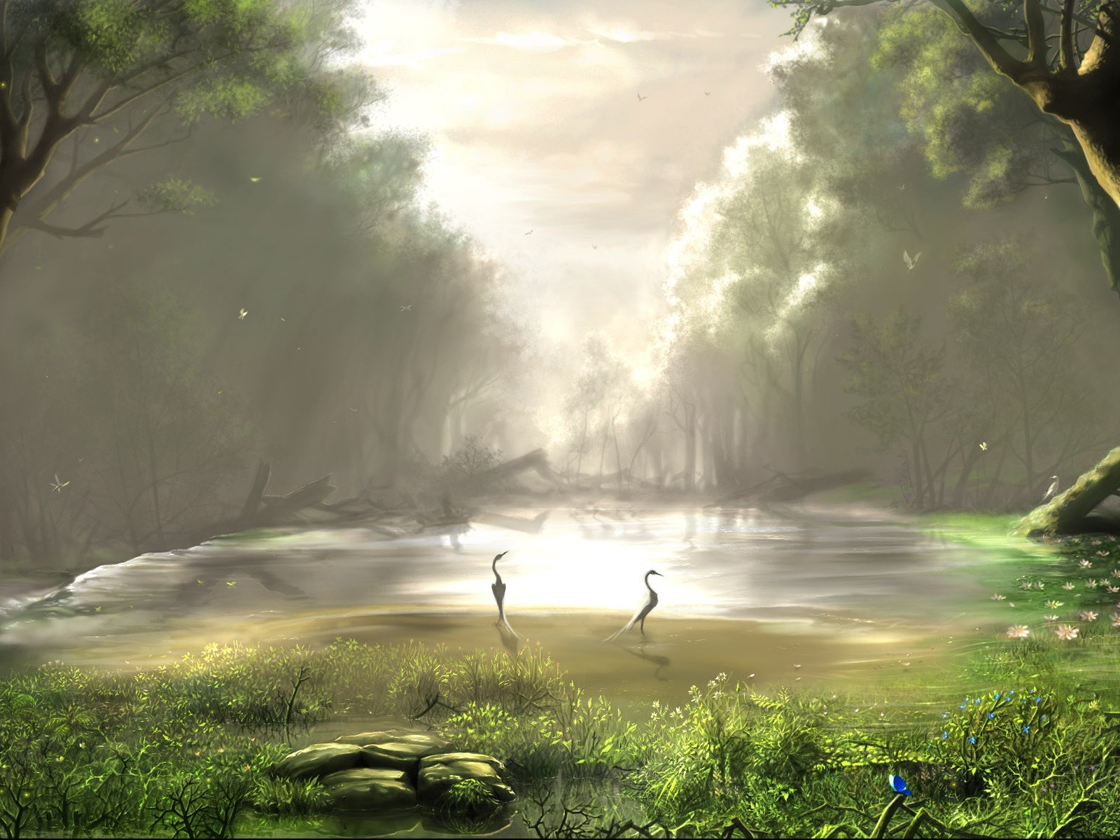 Zeichnung eines Vogels auf einem Pflanzenhintergrund im Wald