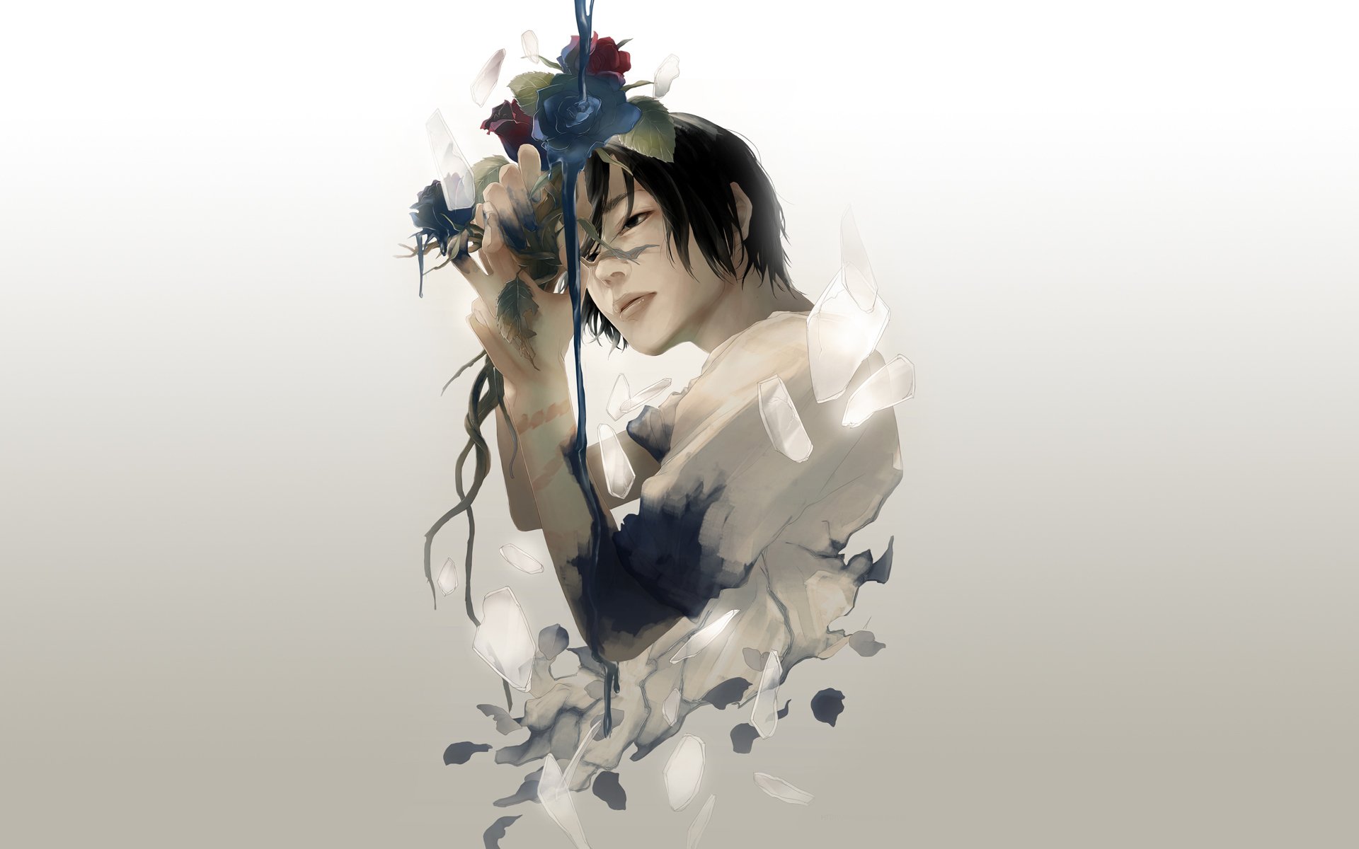 Zeichnung eines Mannes mit Rosen und Scherben