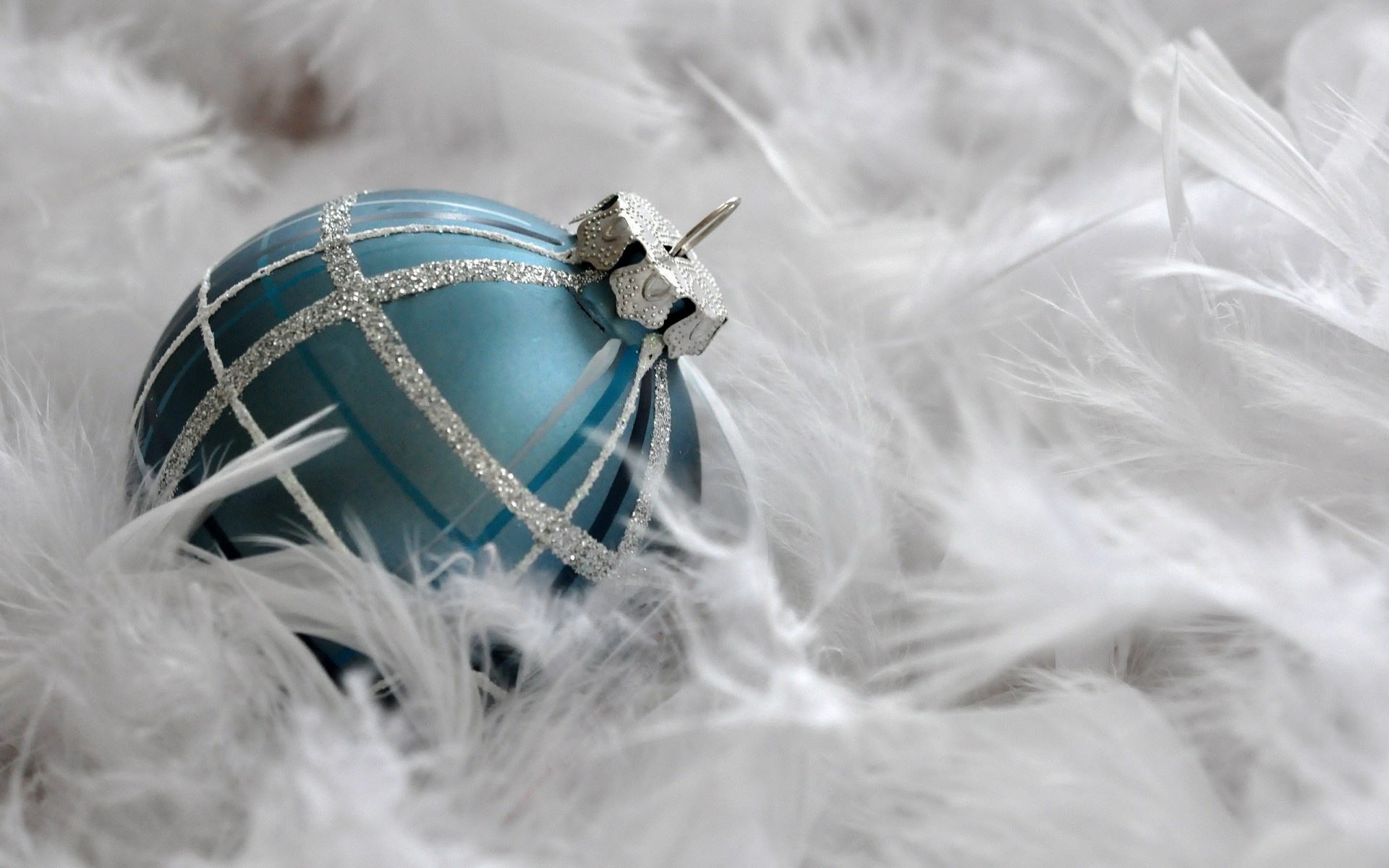 Weiße Weihnachtskugel hängt am Weihnachtsbaum