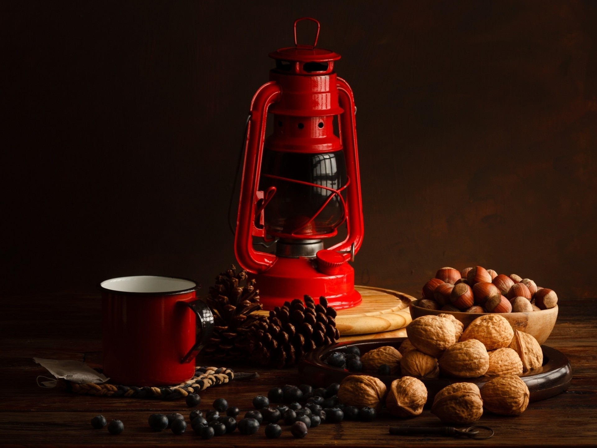 Malerei mit Becher, Laterne, Zapfen und Nüssen