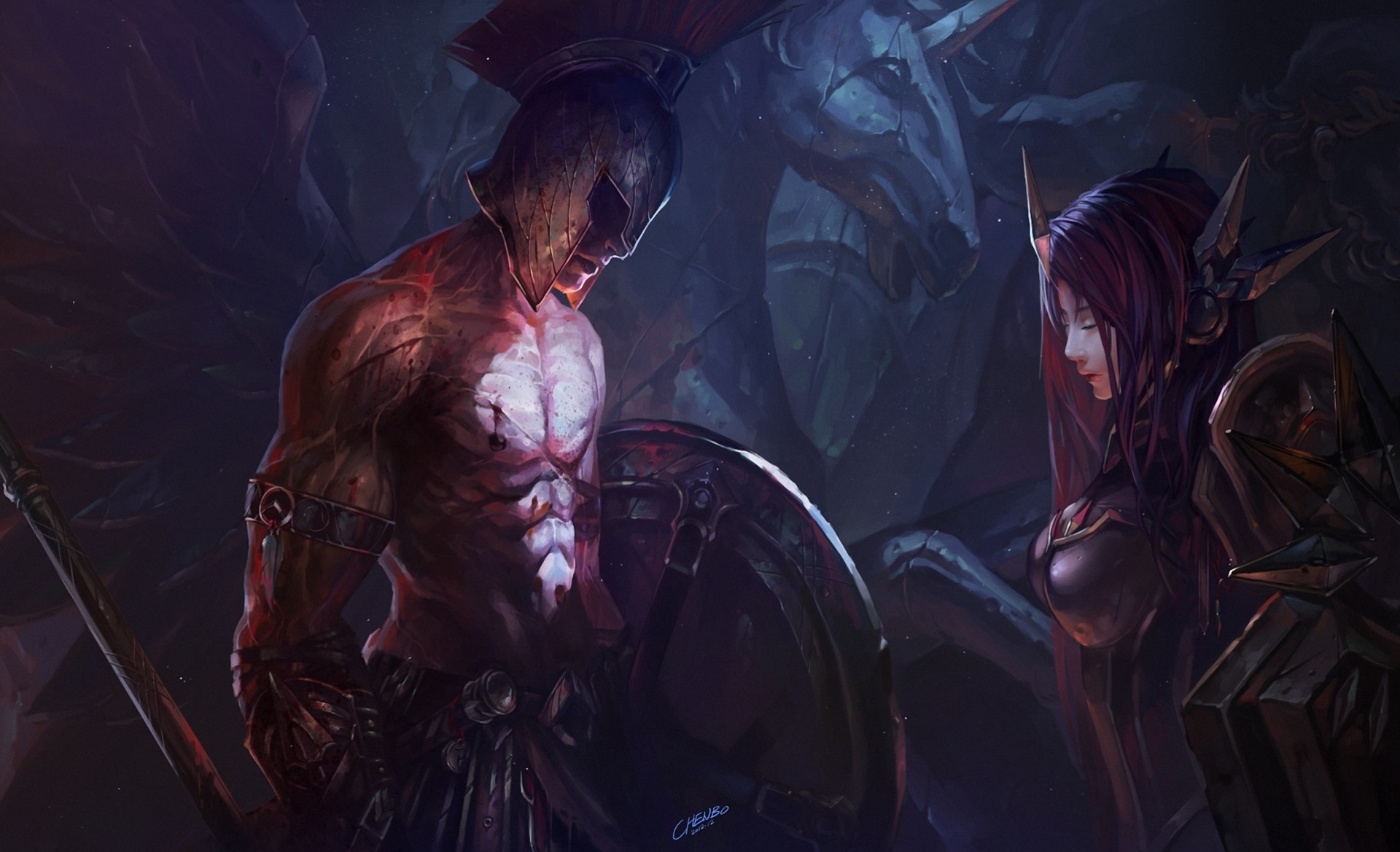 Ein Mädchen in Rüstung und ein Krieger mit einem Helm mit einem Schild