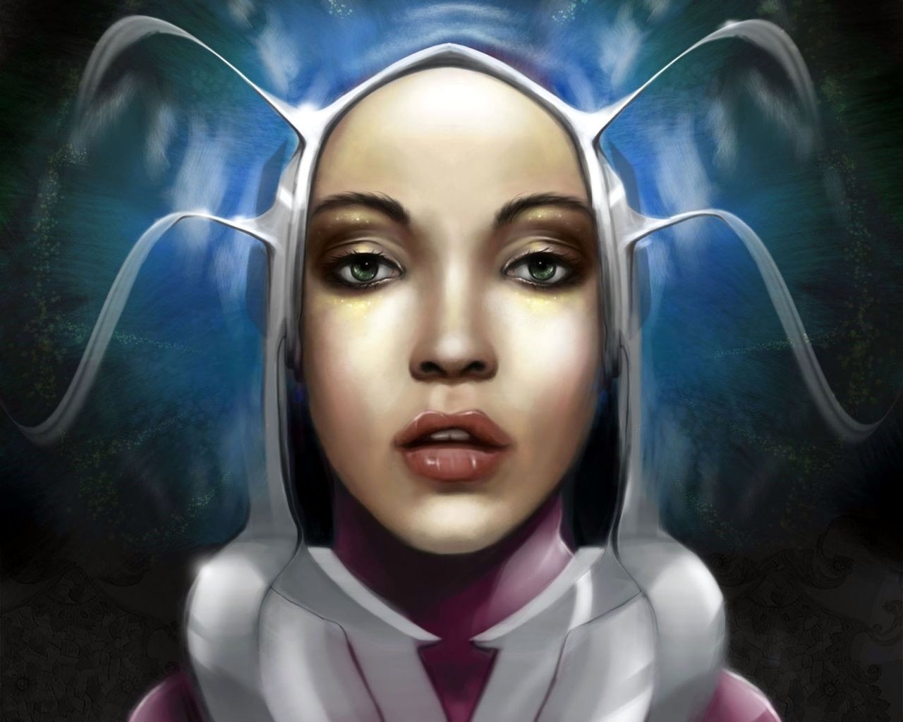 Kopf eines Mädchens mit Mund mit offenem Mund in einer weißen Kappe auf blauem Hintergrund