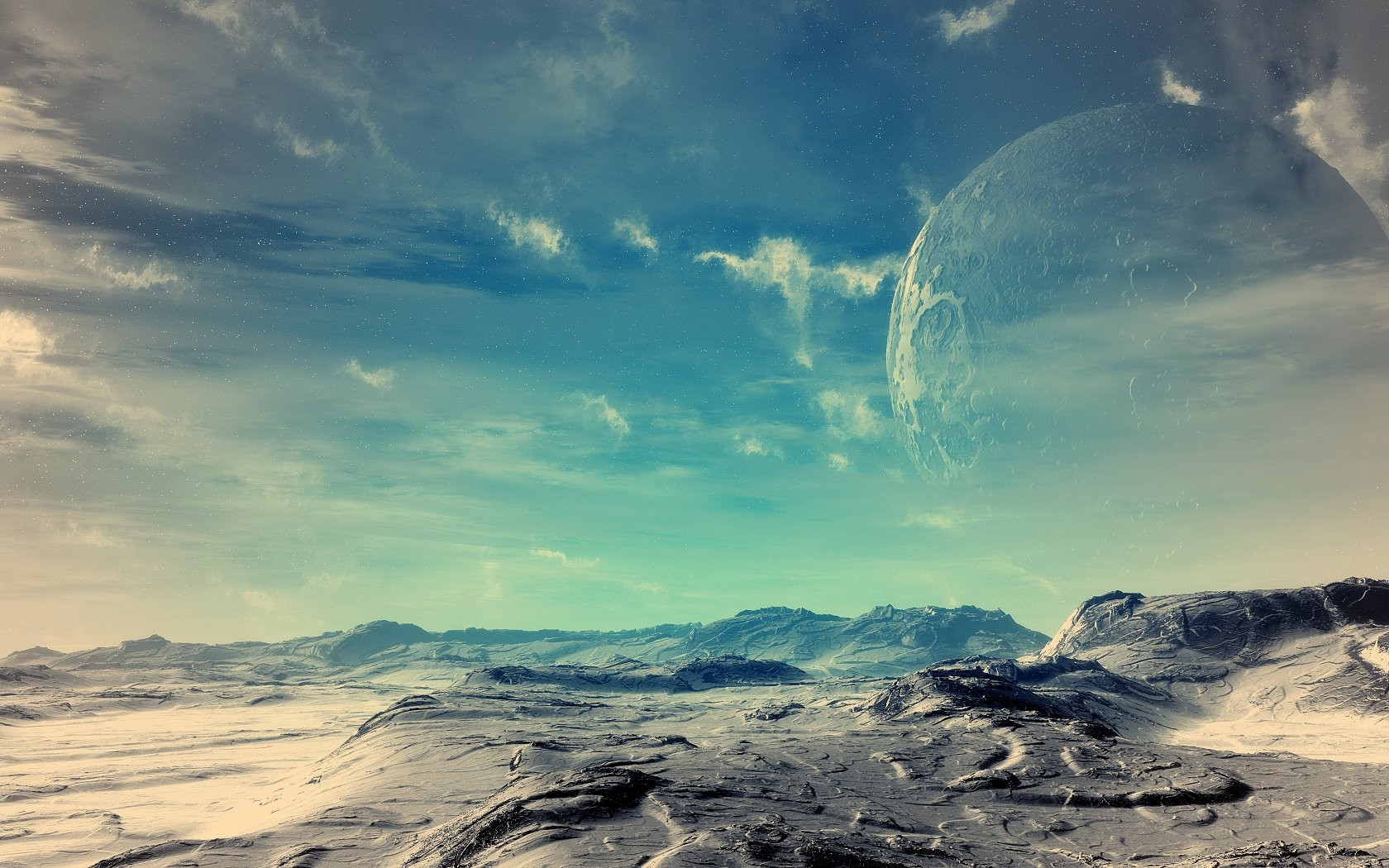 Fantastische Landschaft, in der das Video den Planeten mit bloßem Auge betrachtet