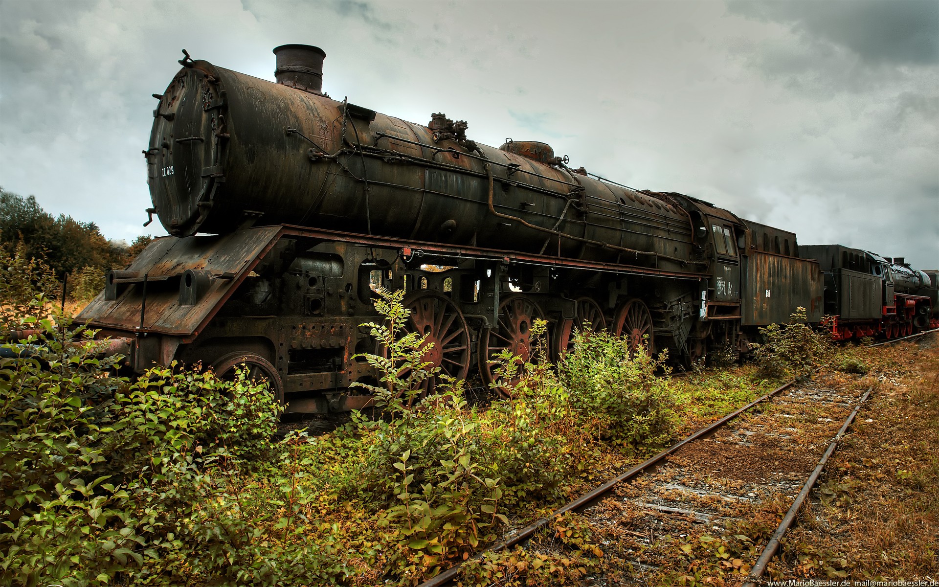 Alte, rostige Zusammensetzung auf dem Hintergrund von Schienen und Büschen
