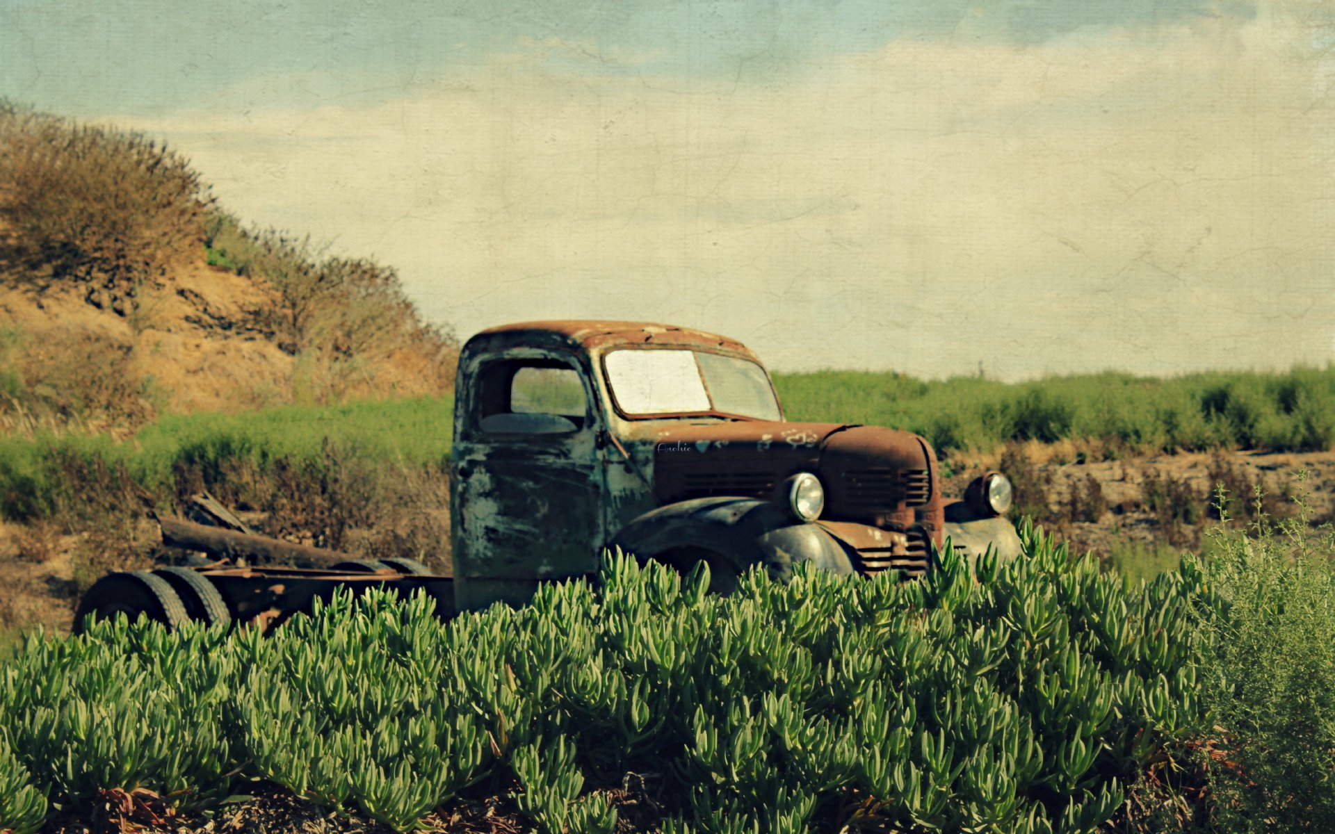 Altes Auto mit eingeschalteten Scheinwerfern in der Natur