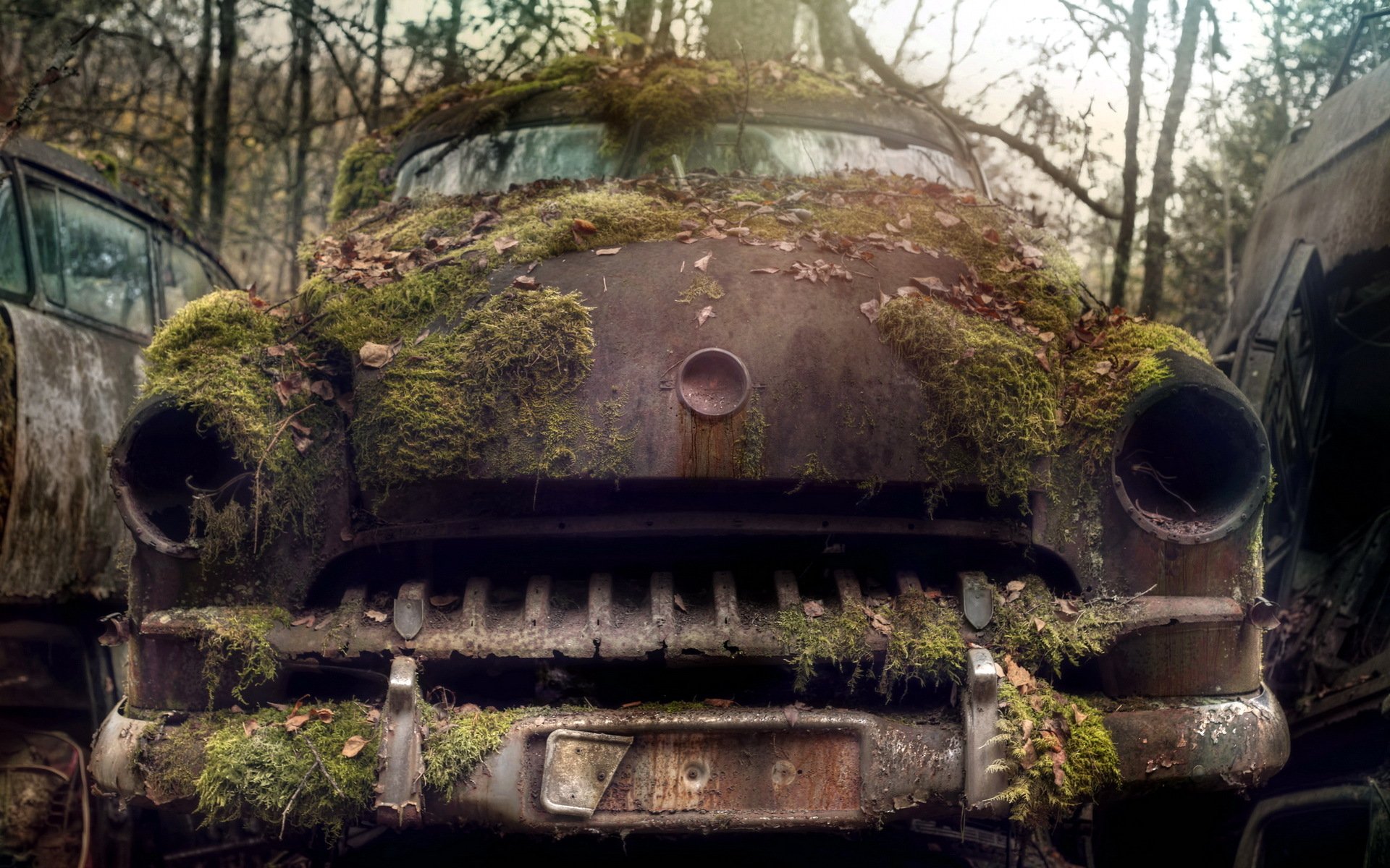 Altes Auto auf dem Parkplatz ist mit Moos bedeckt