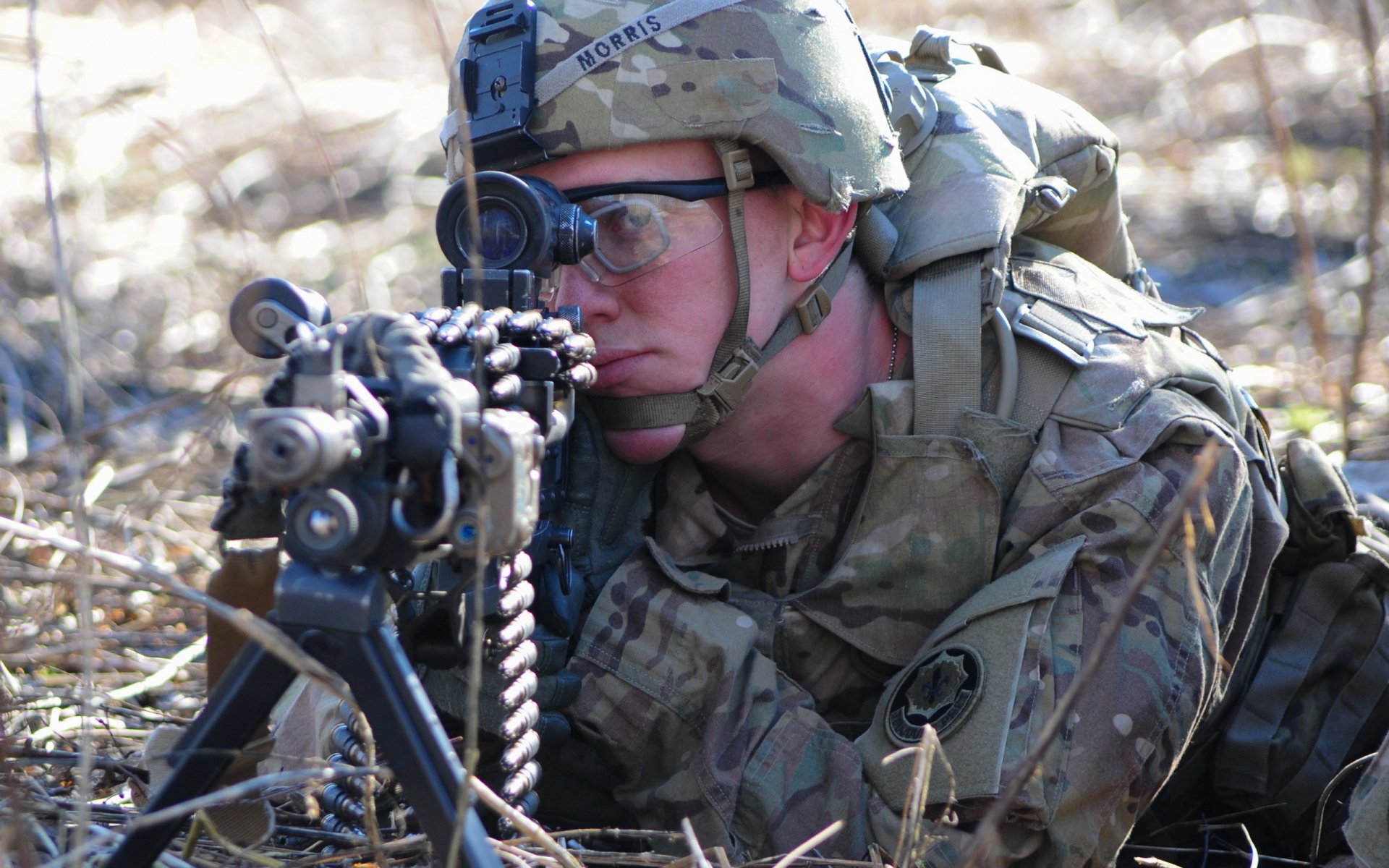 Ein Soldat mit einer Waffe sitzt in einem Versteck