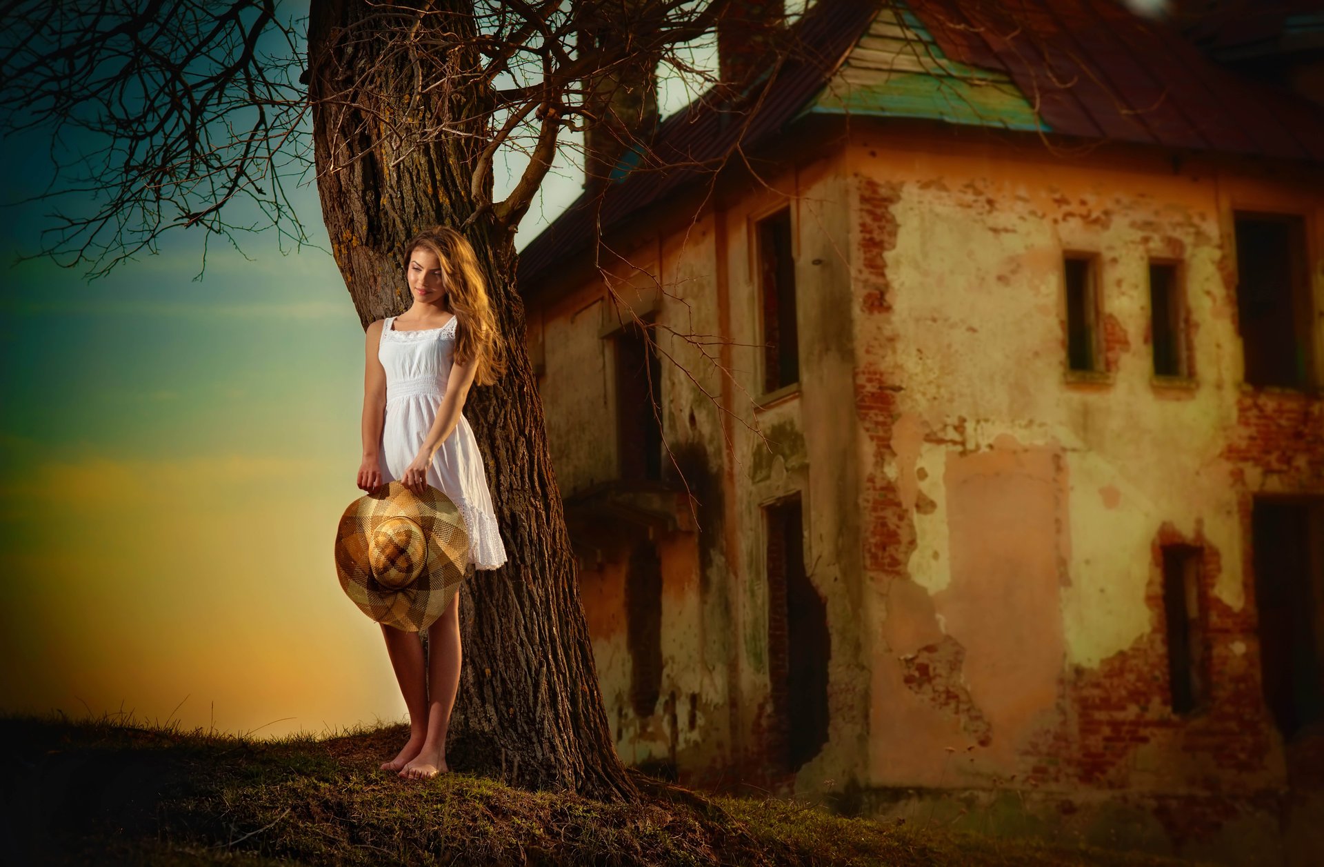 Barfüßiges Mädchen steht an einem verlassenen Haus