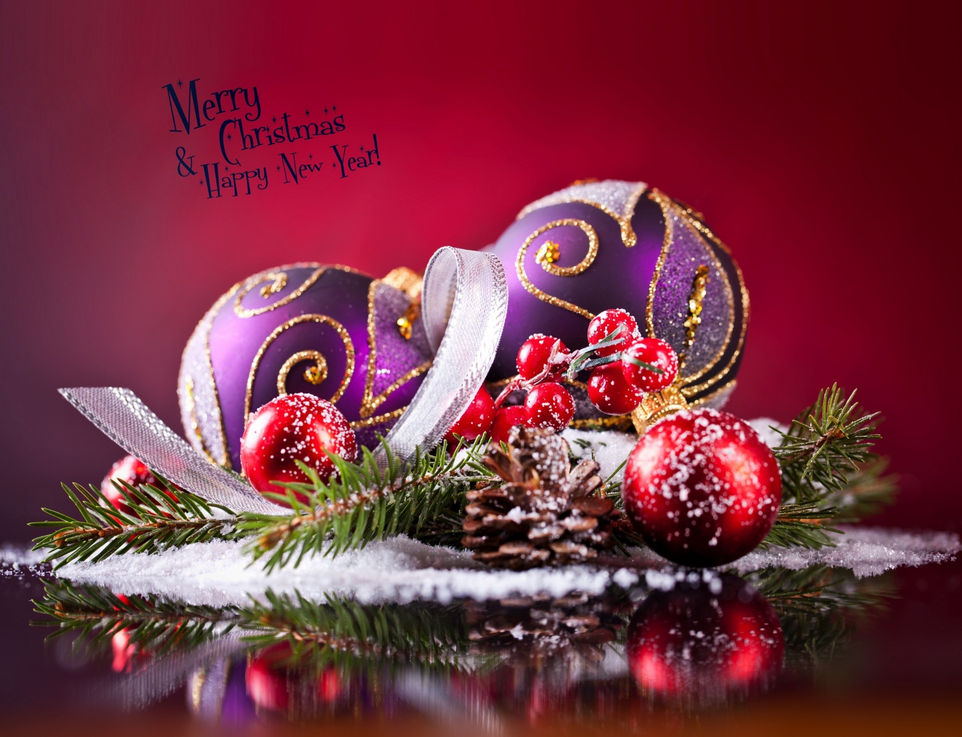 Lila Weihnachtskugeln auf rotem Hintergrund