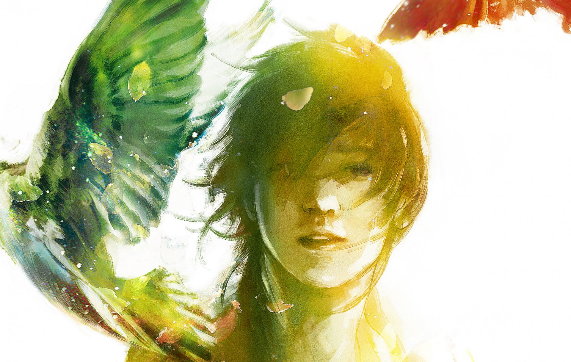 Mann mit Flügeln auf einem Hintergrund von Blütenblättern und Regenbögen