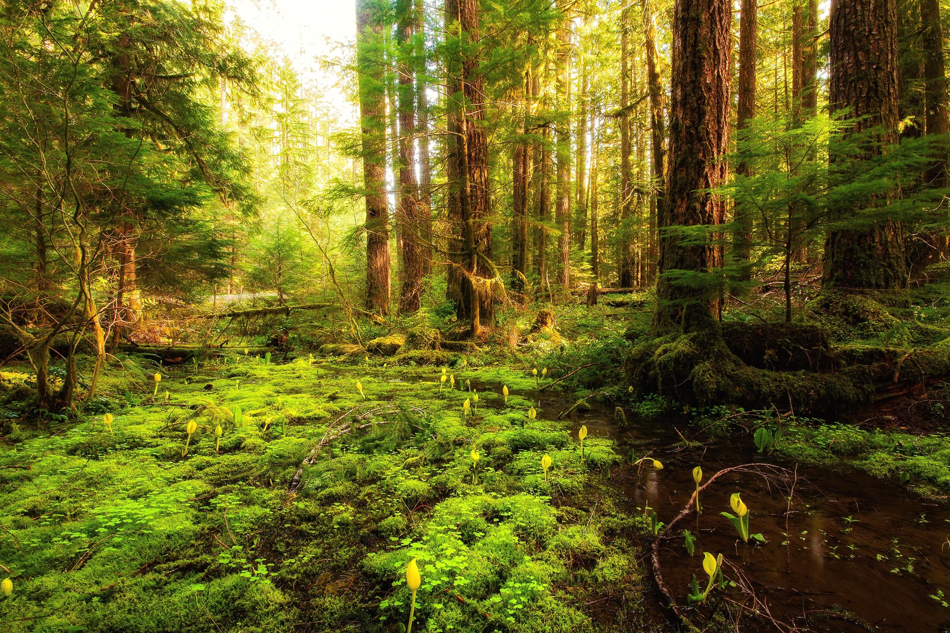 Im Wald blühten Blumen und das Gras grünte sich