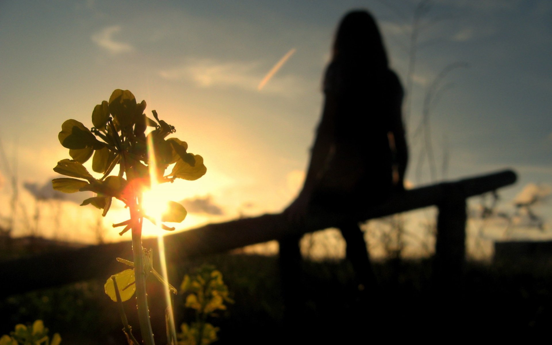 Das Mädchen sitzt auf einer Bank und bewundert den Sonnenuntergang