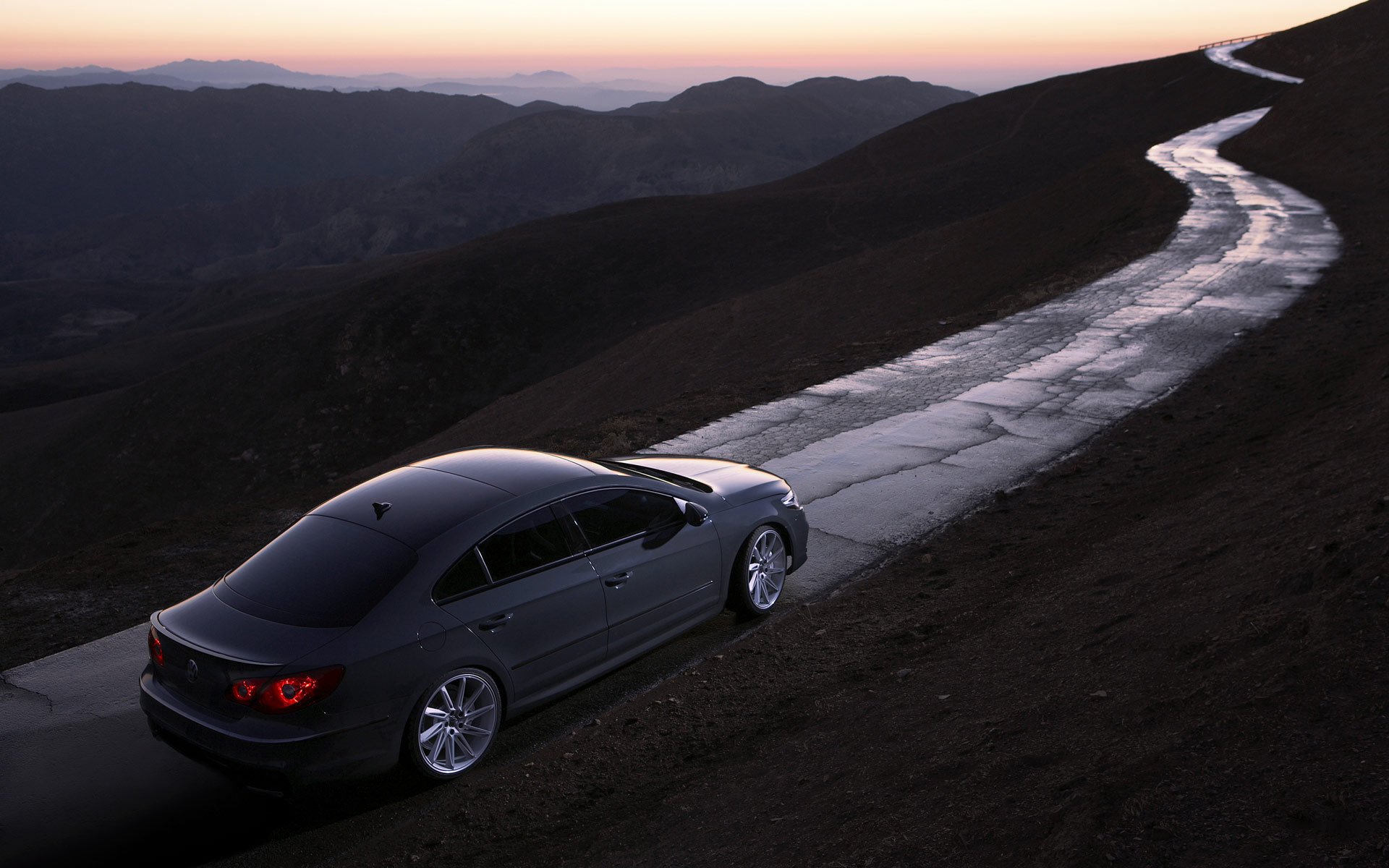 Nissan Maxima auf einer Bergserpentin. Sonnenuntergang
