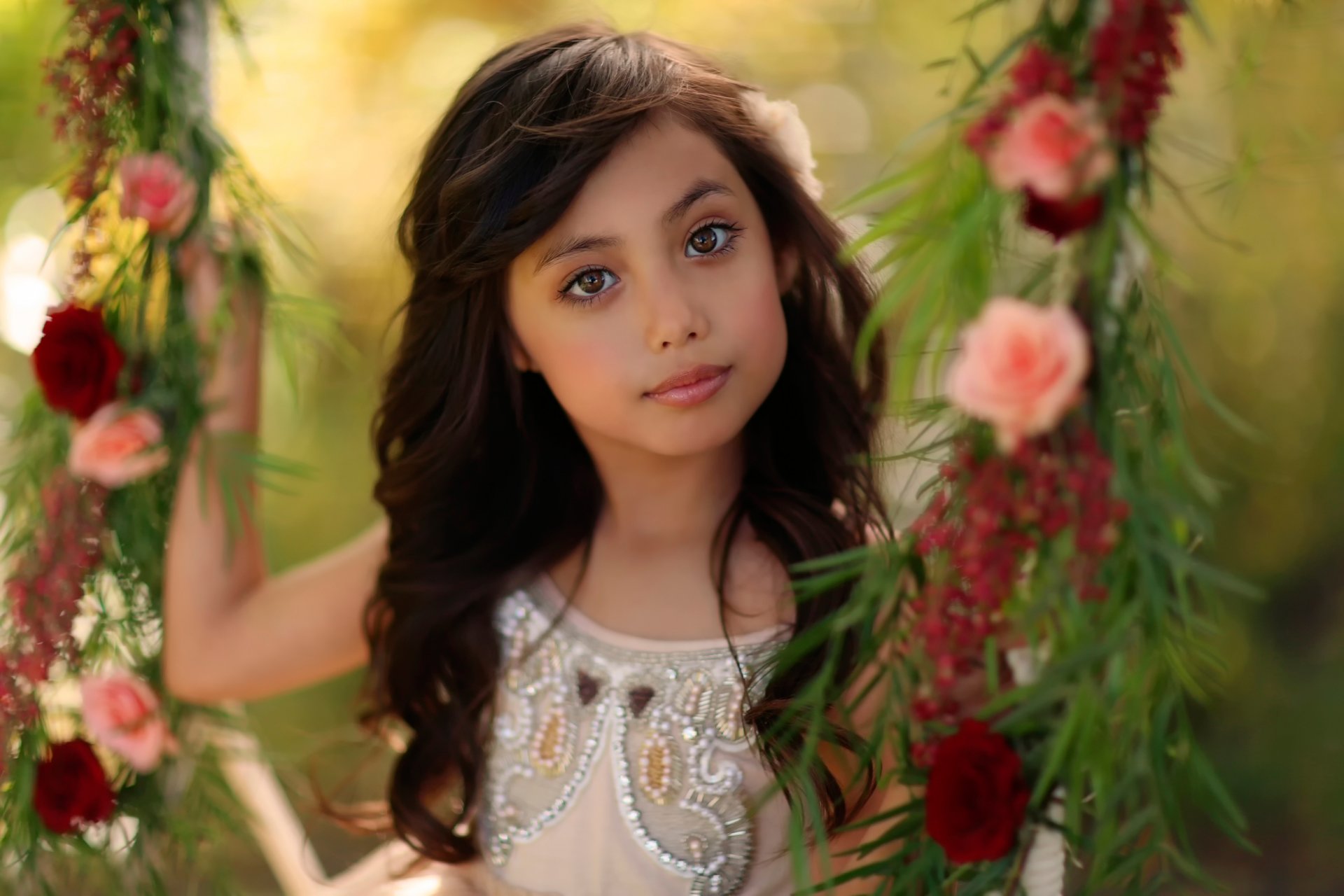 Mädchen auf einer wunderschön mit Blumen geschmückten Schaukel