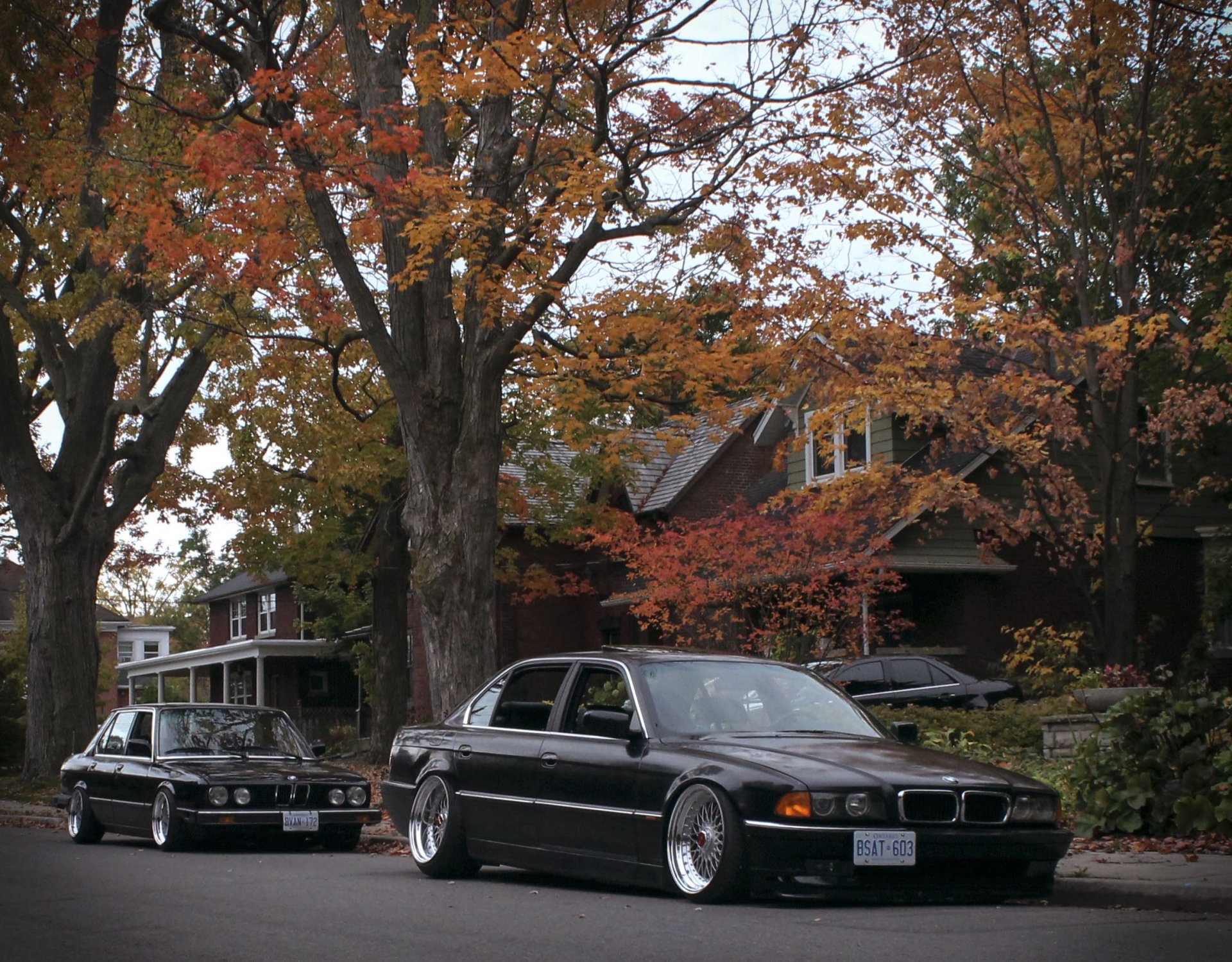 BMW inmitten der Herbstlandschaft und der gefallenen Blätter