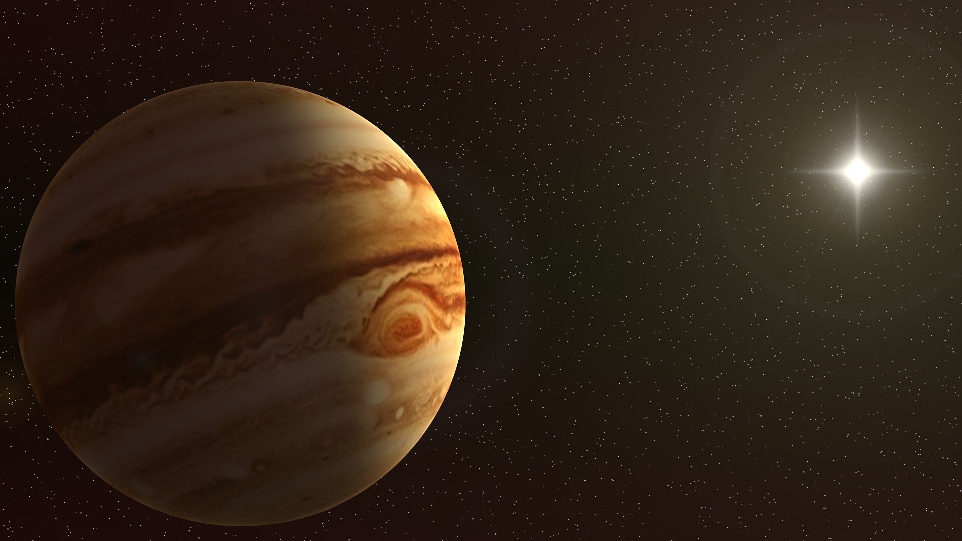 Blick aus dem Weltraum auf Jupiter. In der Ferne sieht man die Sonne