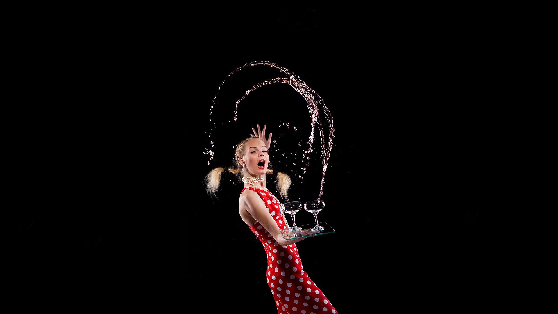 Blondine mit einem Tablett in den Händen in einem Spritzer Champagner