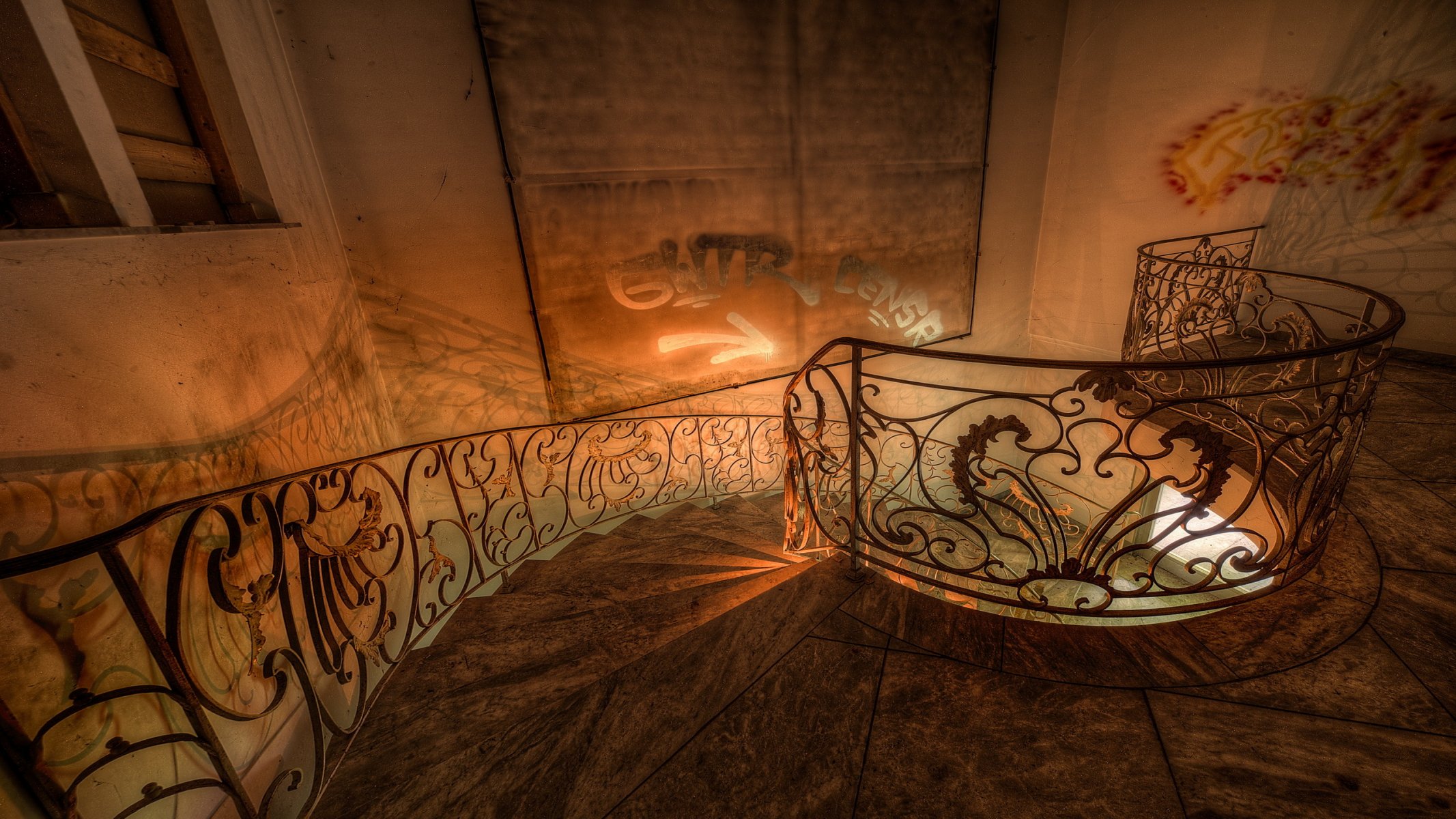 Eine Treppe vor orangefarbenem Hintergrund führt nach unten
