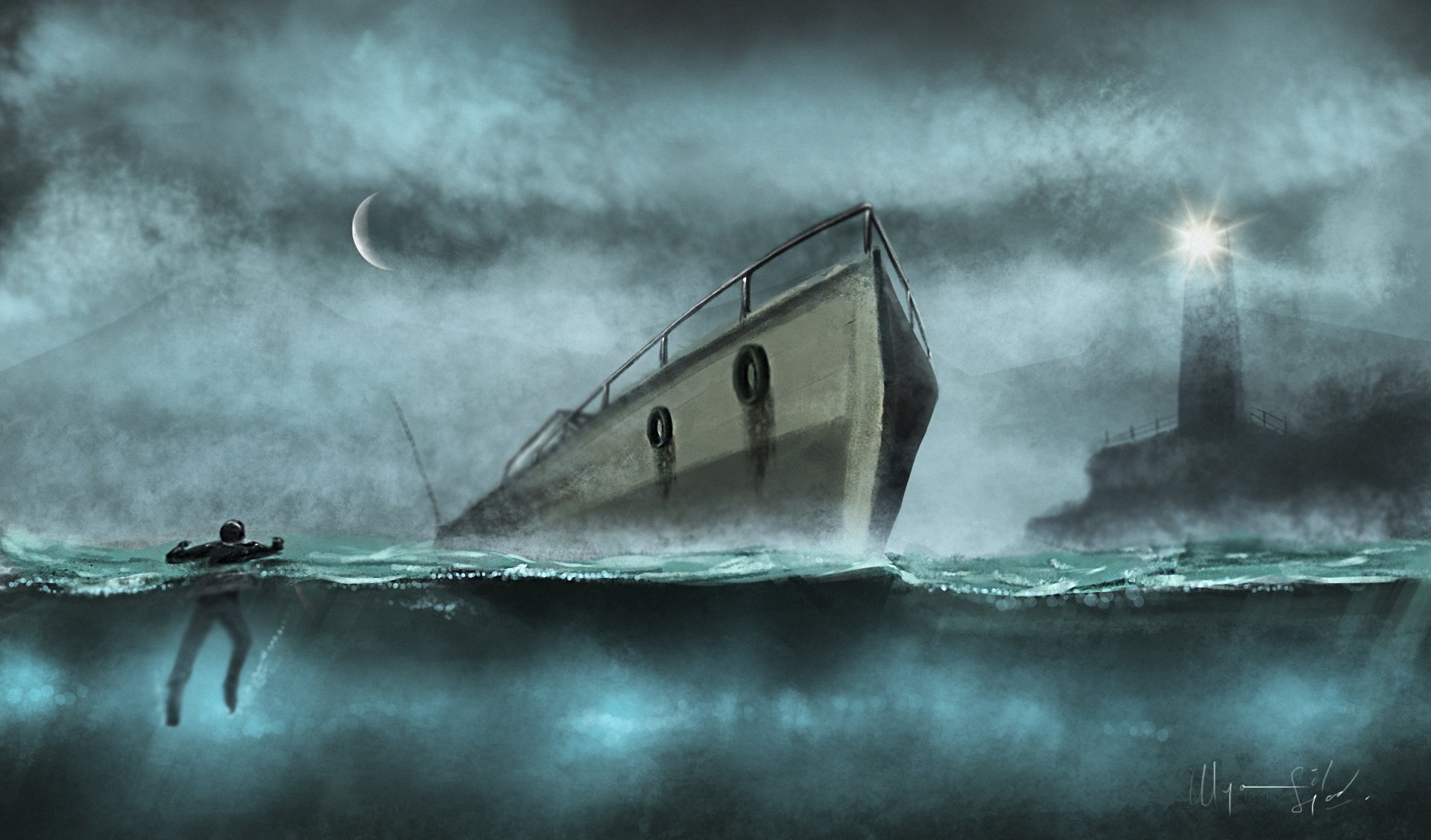 Ein Panorama-Morgen öffnet den Blick auf das Grasfeld, ein fließender Bach und ein Leuchtturm steht in der Ferne