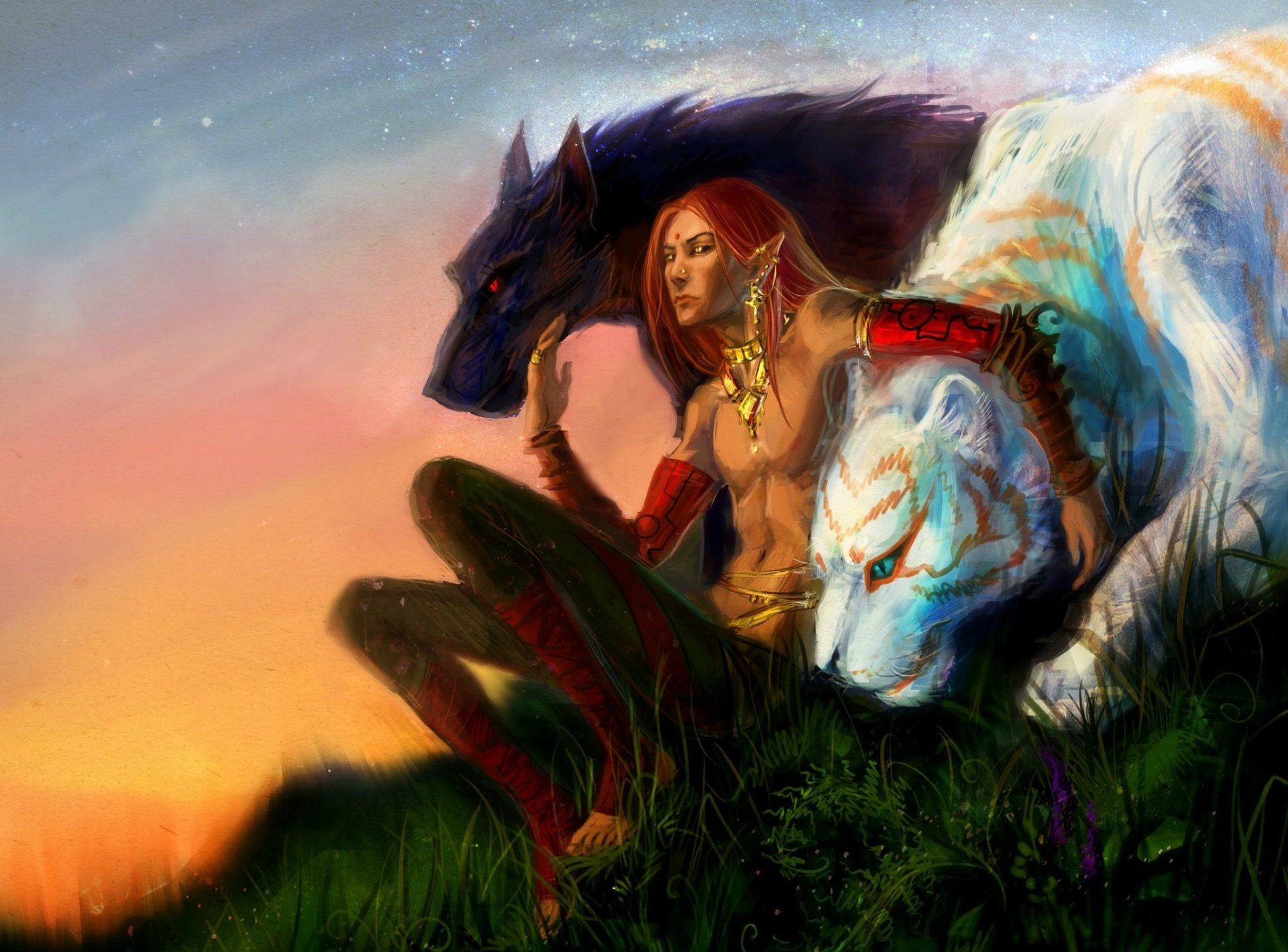 Die Kunst des Elfenkindes wird von Tieren in Form eines weißen Tigers und eines schwarzen Wolfes mit roten Augen begleitet
