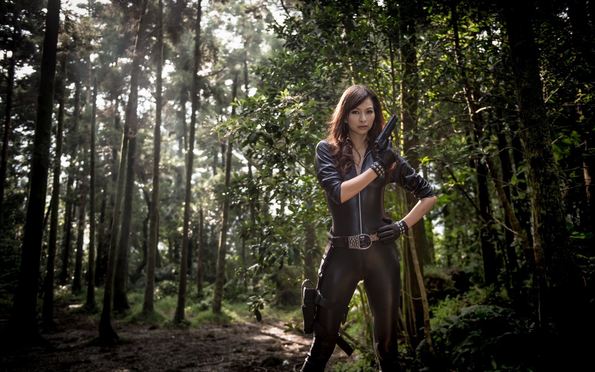 Ein Mädchen mit einer Pistole allein mitten im Wald