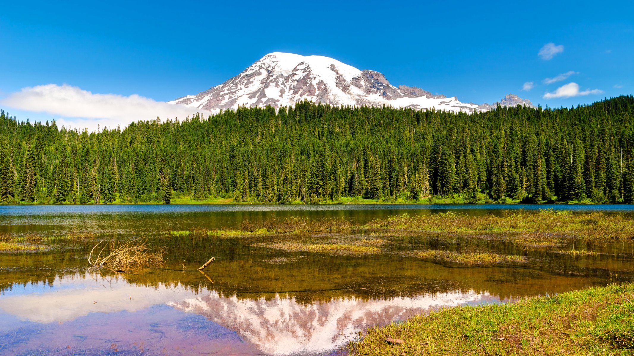 Der Berg hinter den Bäumen spiegelt sich im See wider