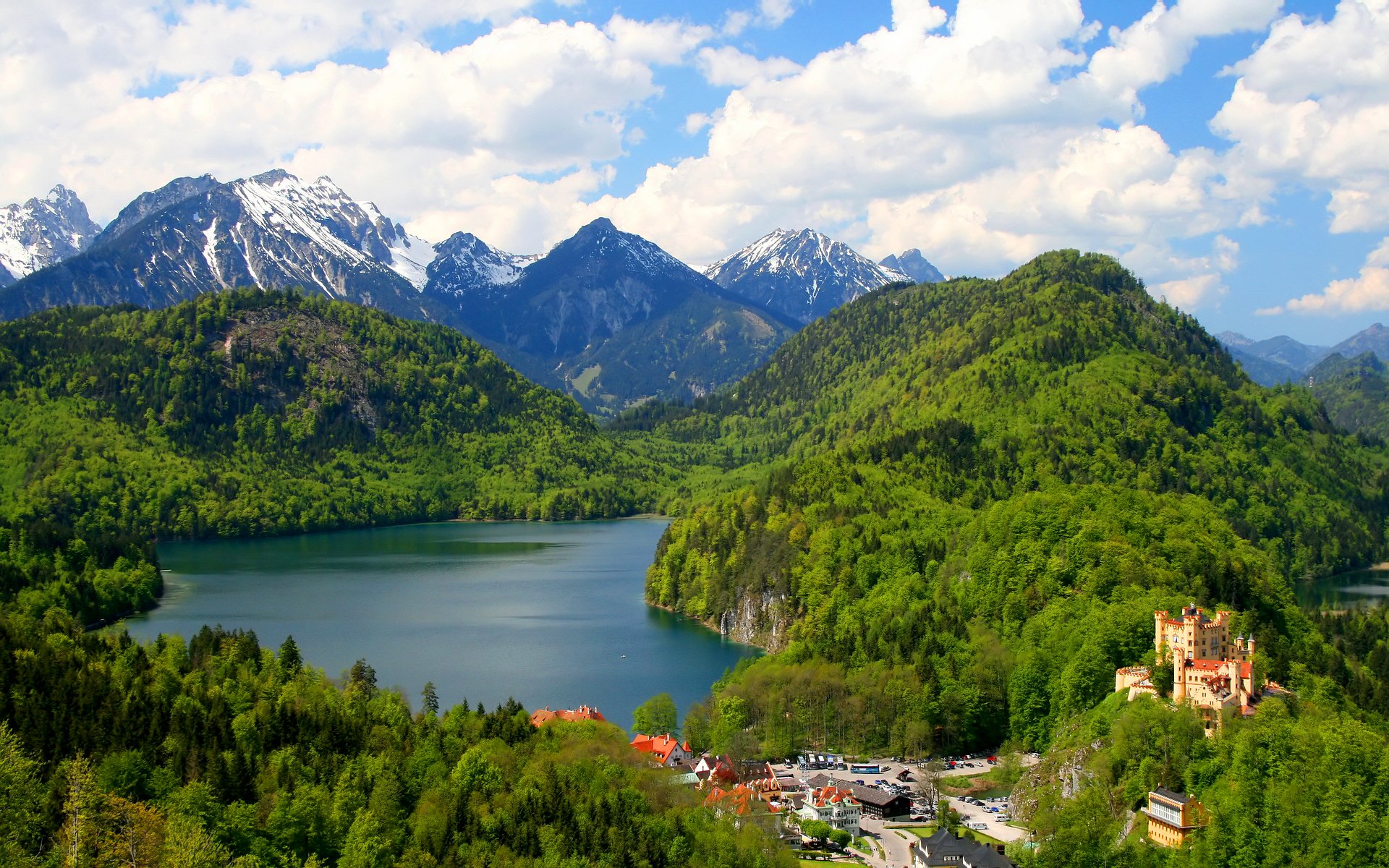 Pferde und Menschen vor dem Hintergrund der Berge und des Teiches in Kanada