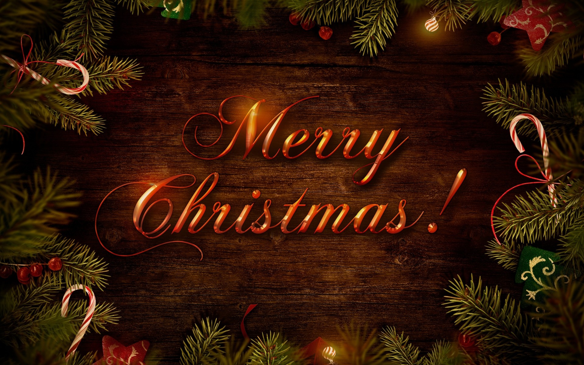 Die Aufschrift "Frohe Weihnachten" auf dem Hintergrund von Ästen und Süßigkeiten.