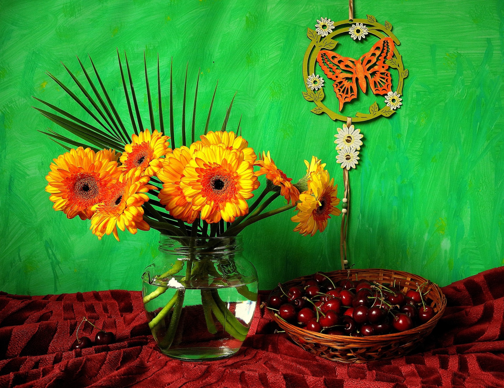 Inszenierung von Chrysanthemen und Kirschen auf grünem Hintergrund
