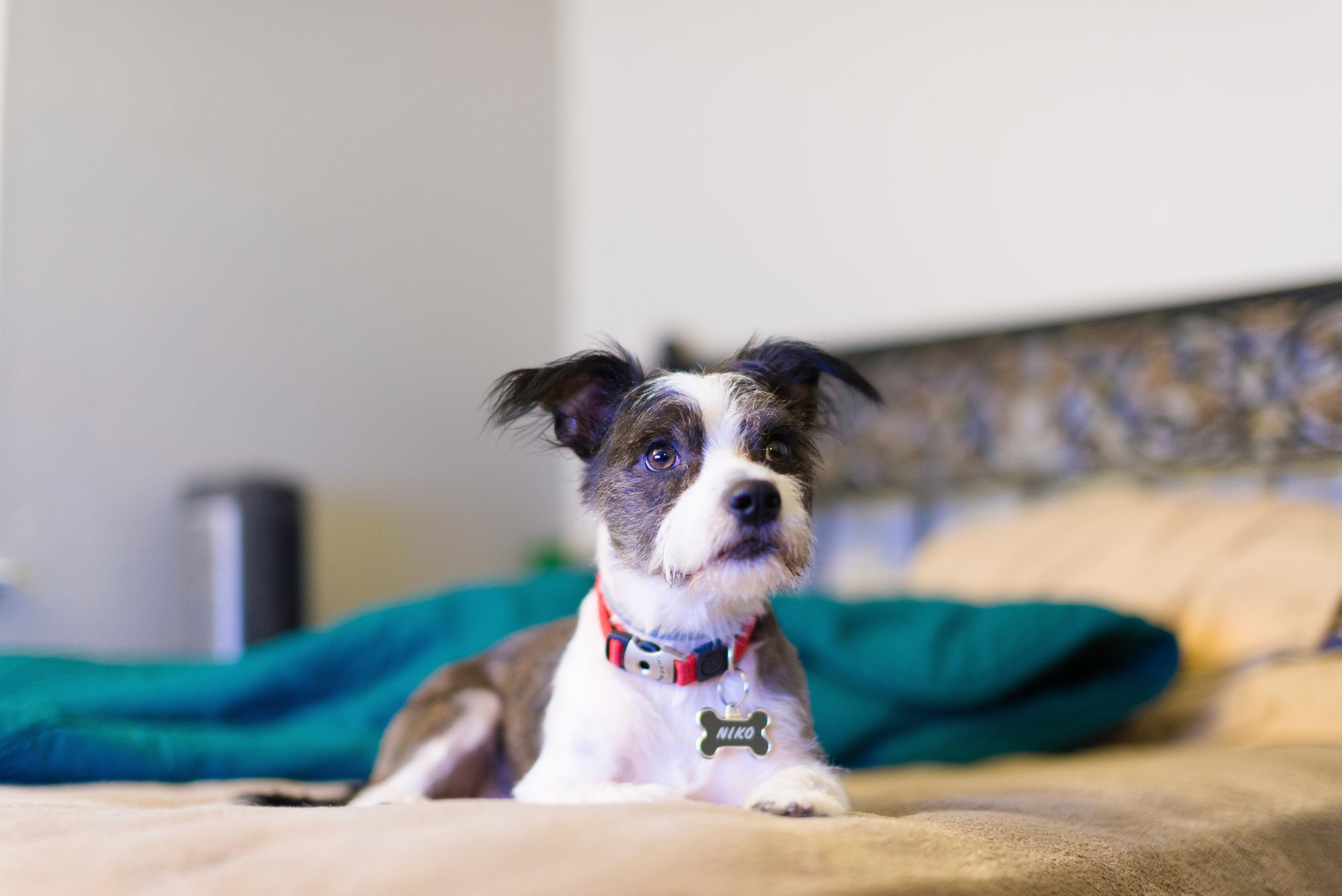 Ein lustiger Hund liegt im Halsband mit einem Knochen auf dem Bett