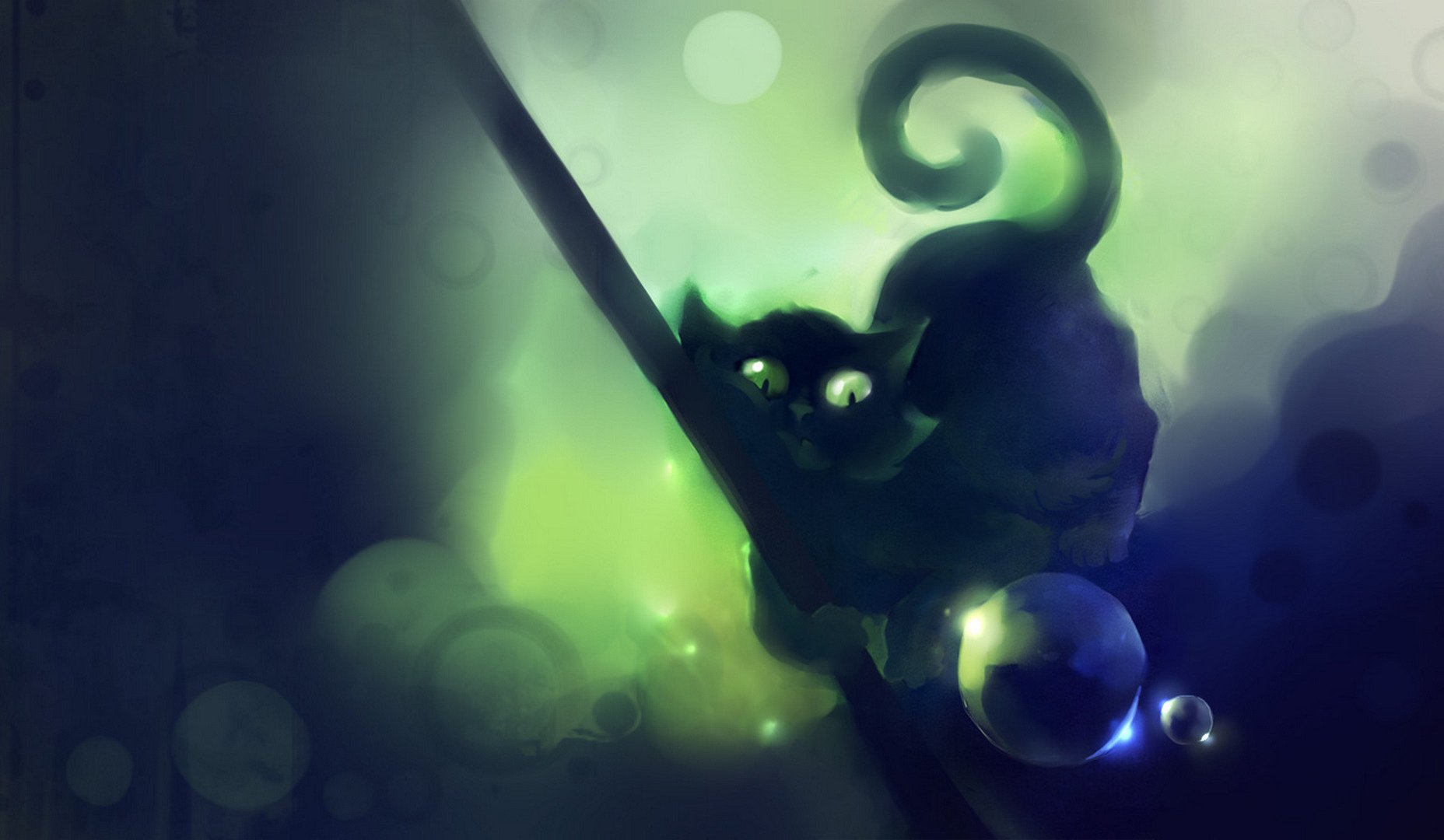 Zeichnung einer schwarzen Katze mit großen grünen Augen. Auf dem Hintergrund der schwarzen und grünen Blasen