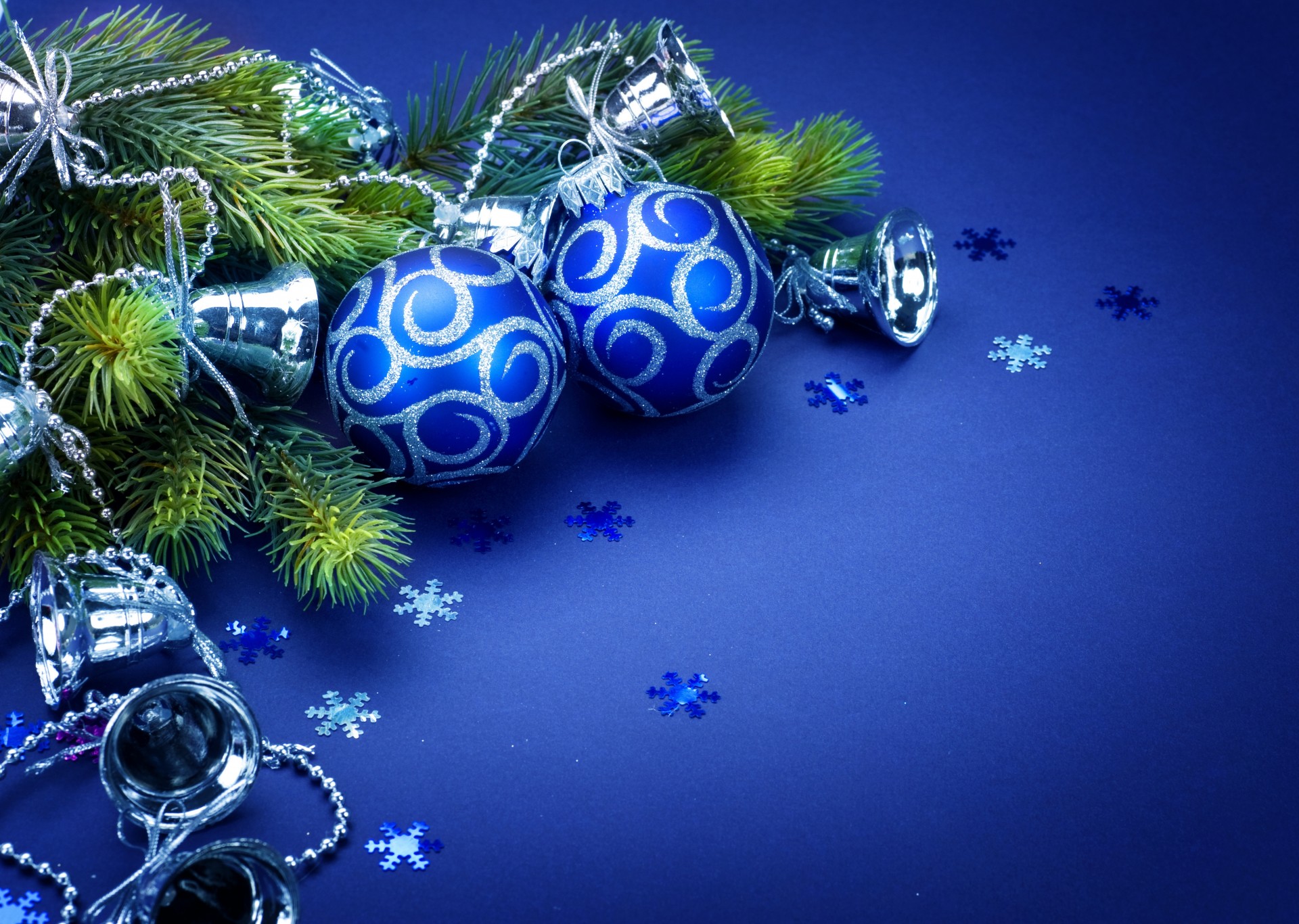 Silbrig-blaue Weihnachtsspielzeuge liegen auf dem Schnee auf einem silbrig funkelnden Hintergrund