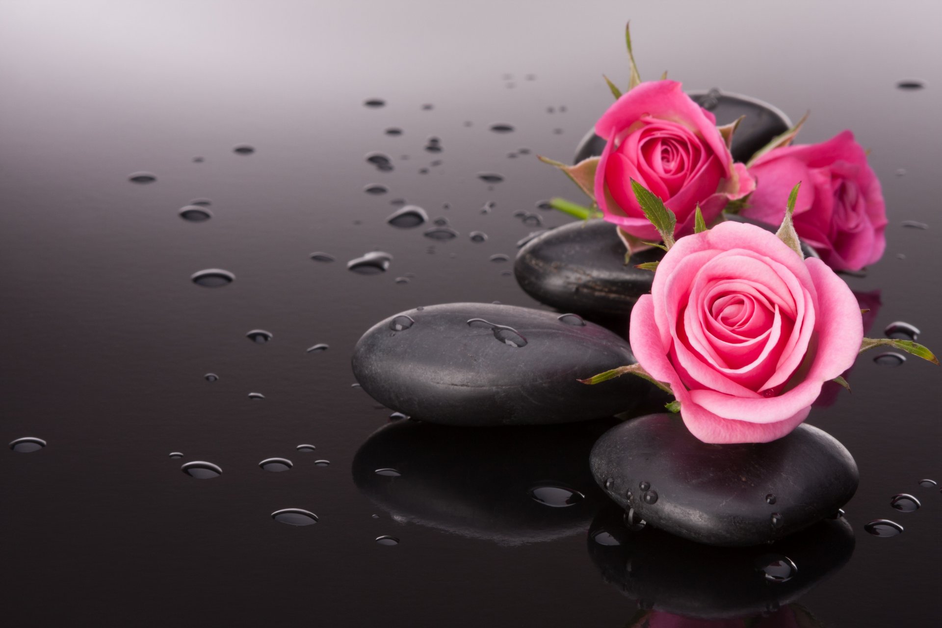 Nasse Rosen auf schwarzen Steinen