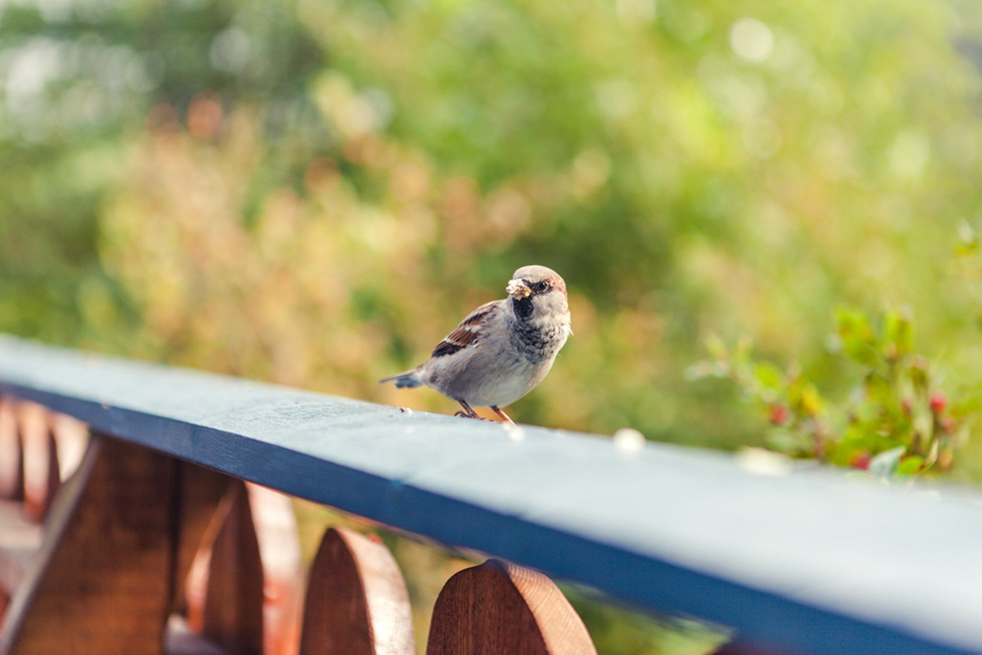 Ein Spatz springt über ein blaues Brett