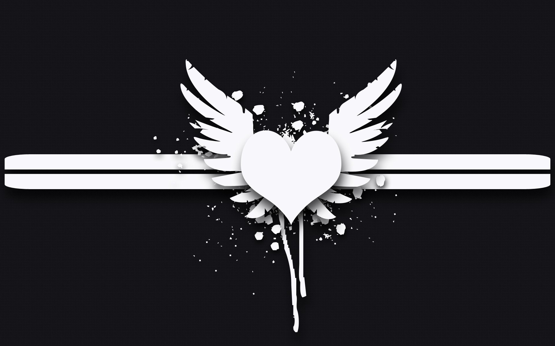 Weißes Herz mit Flügeln und Mustern auf schwarzem Hintergrund