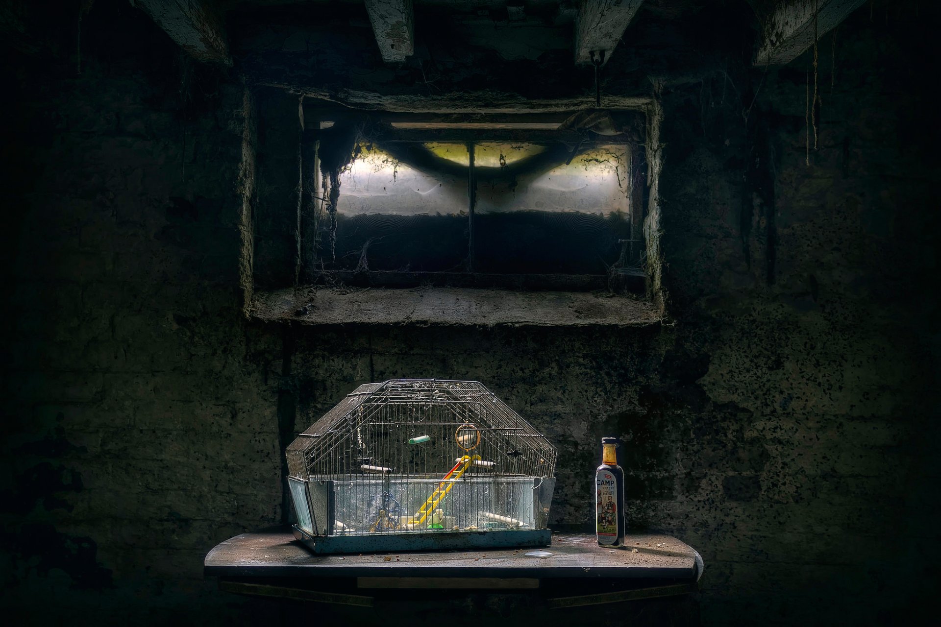 Käfig auf dem Tisch unter dem Fenster mit Spinnweben