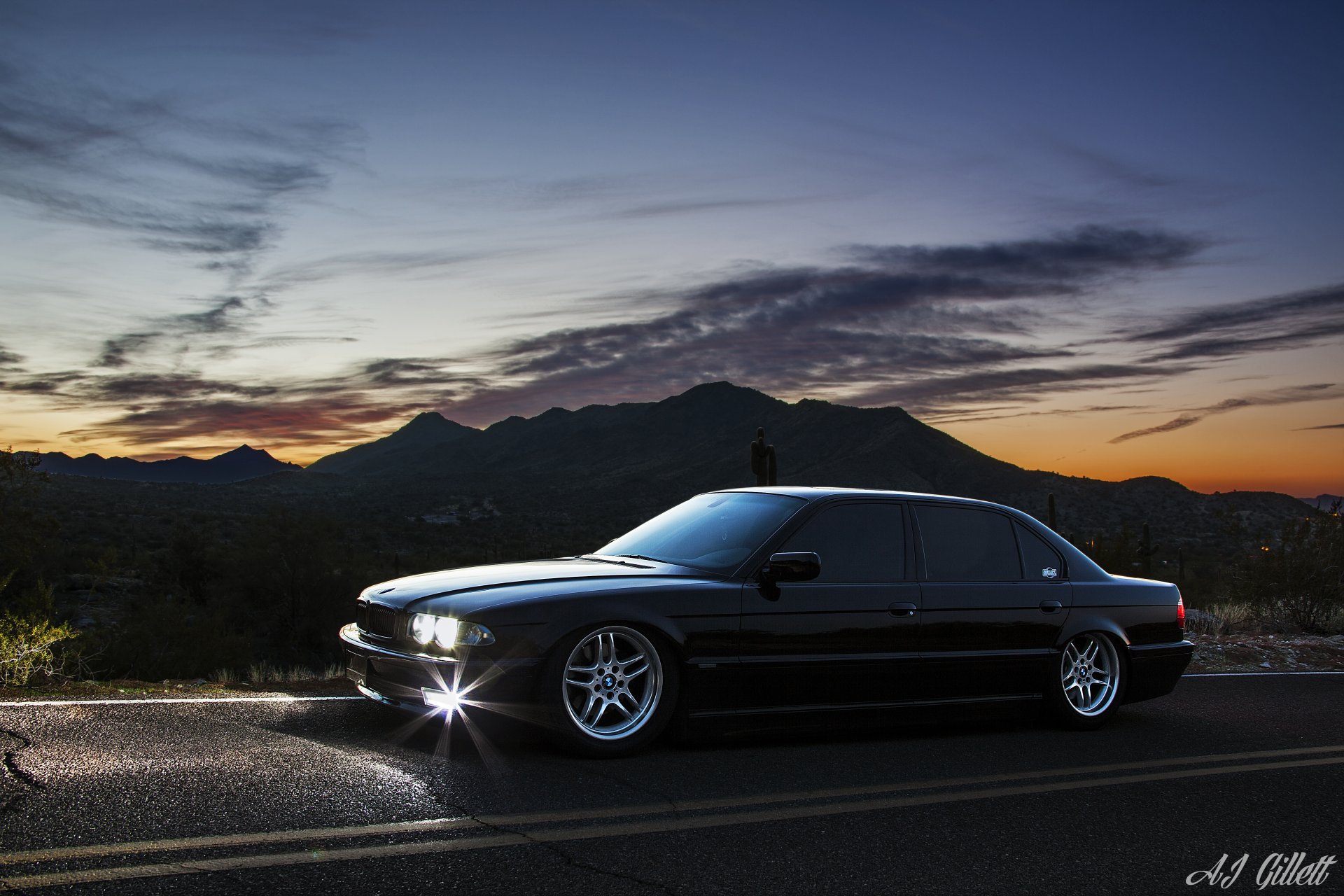 Der getunte schwarze Boomer glänzt mit Scheinwerfern nach vorne
