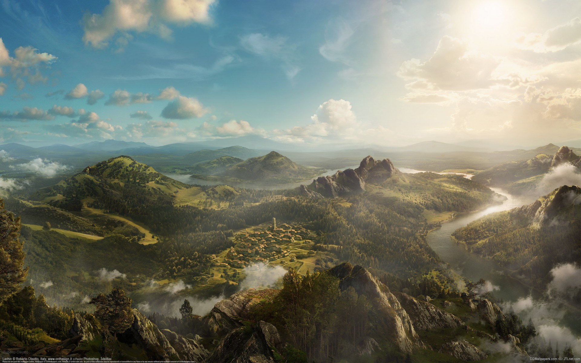 Fantastisches Tal mit Bergen und Wolken über ihnen