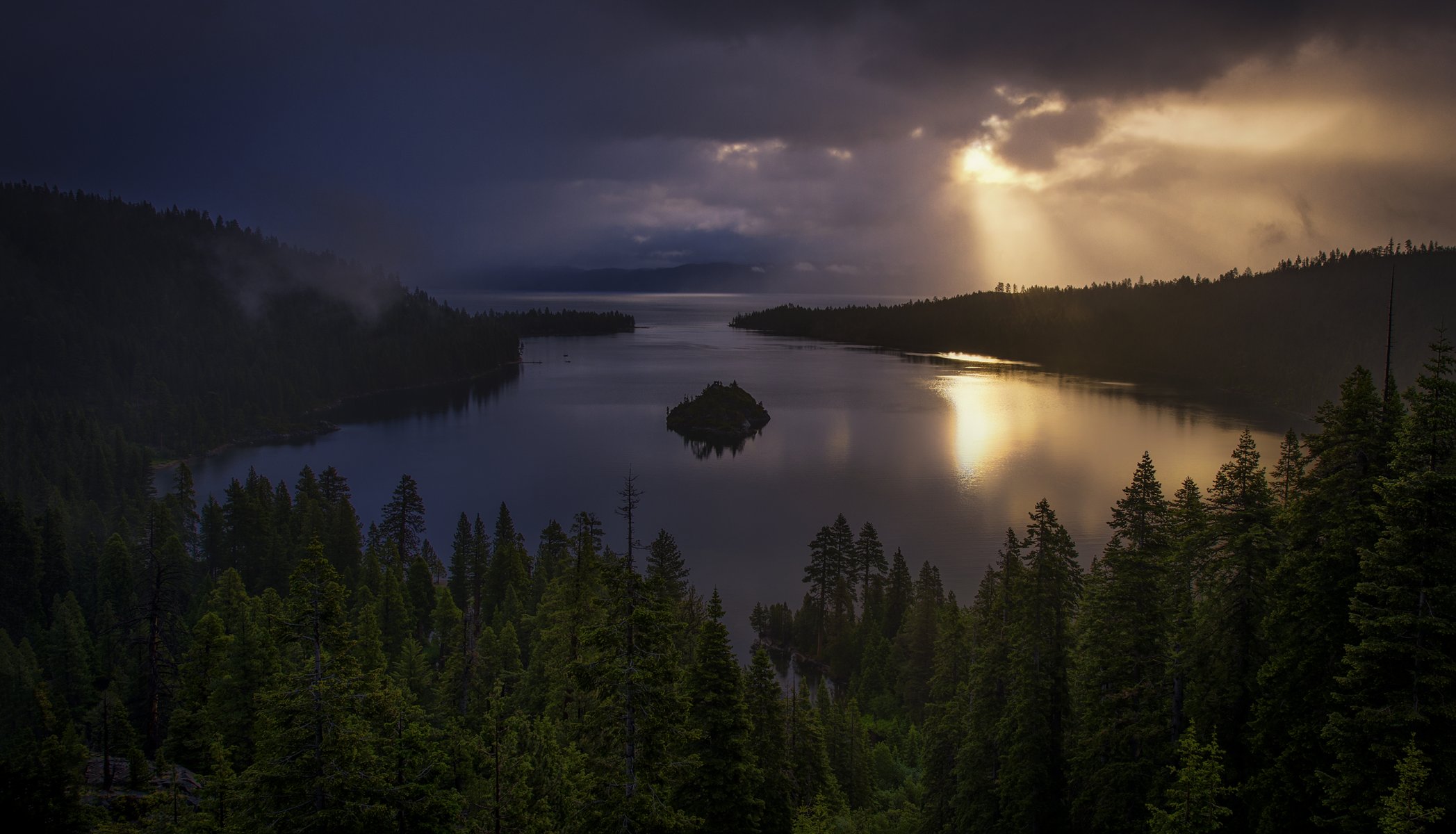 Das Licht der Sonne schleicht sich durch die Wolken in der Waldbucht