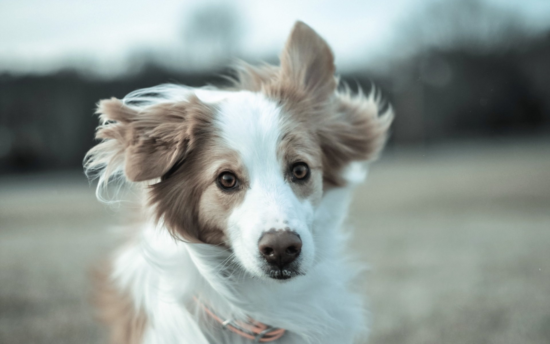 Zottiger Hund schaut in einem Sprung in die Kamera