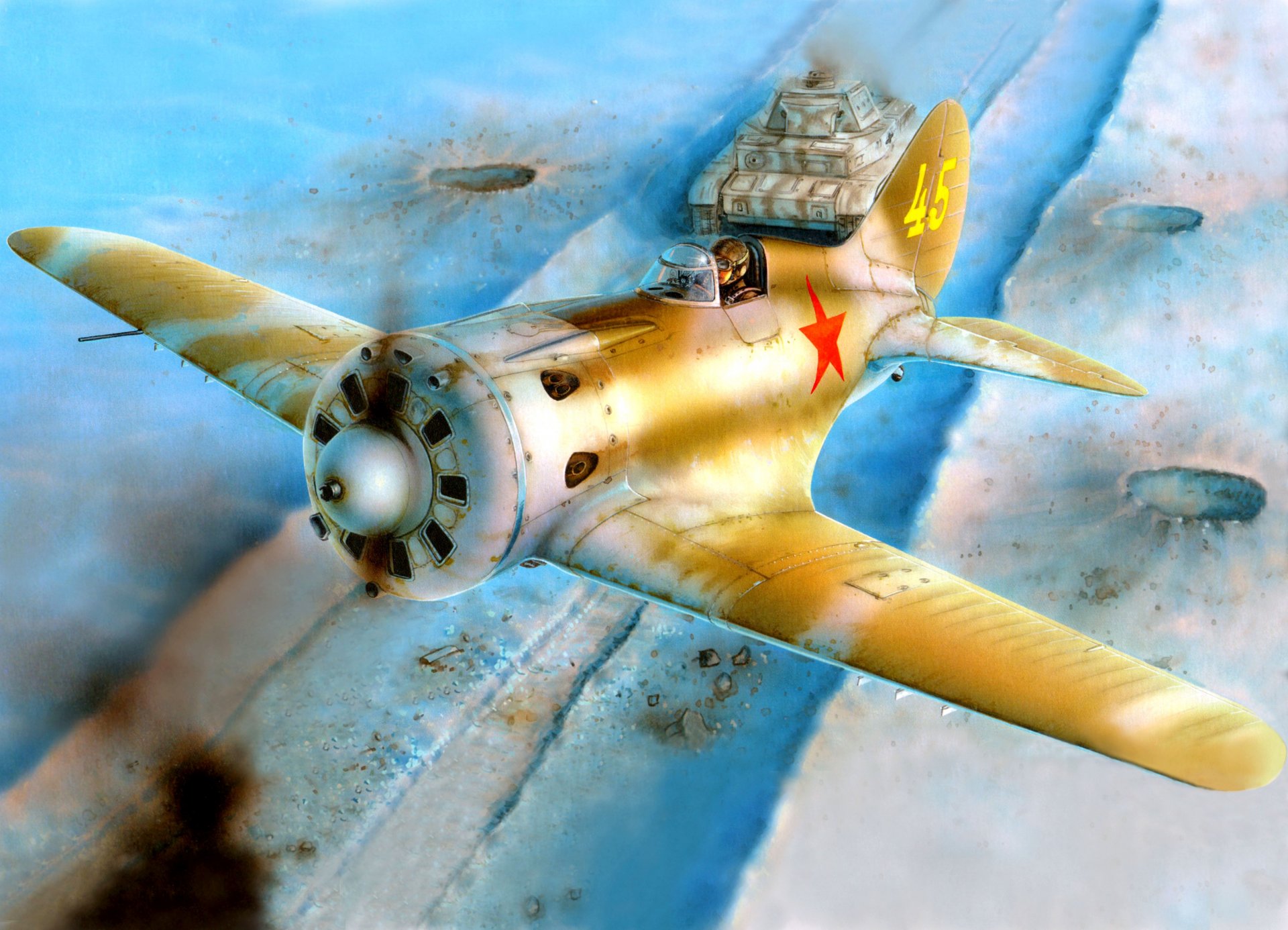 Sowjetischer Kampfjet fliegt über die Frontstraße