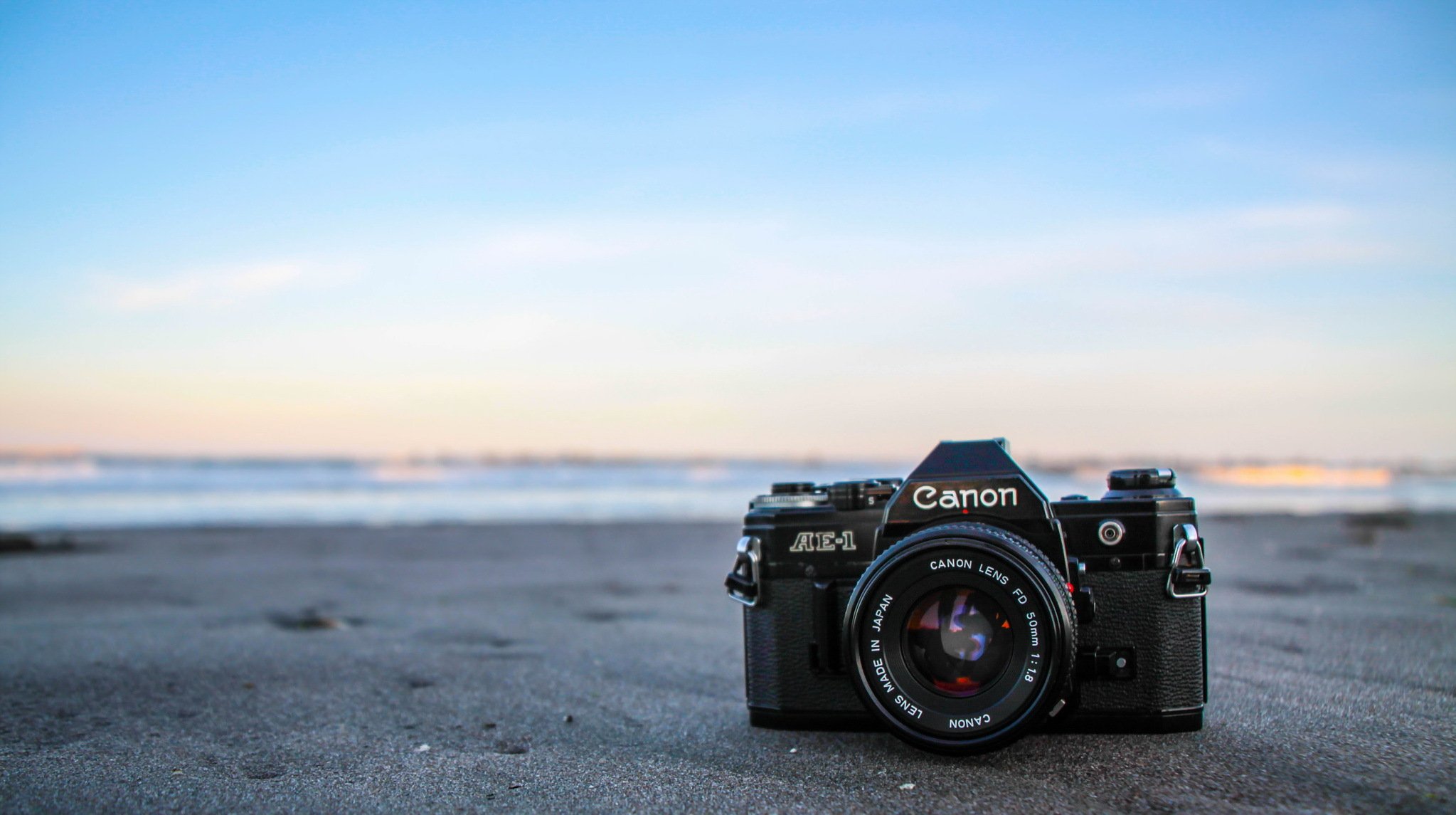 Desktop mit einem Apple-Notebook, das von Canon umschlossen ist