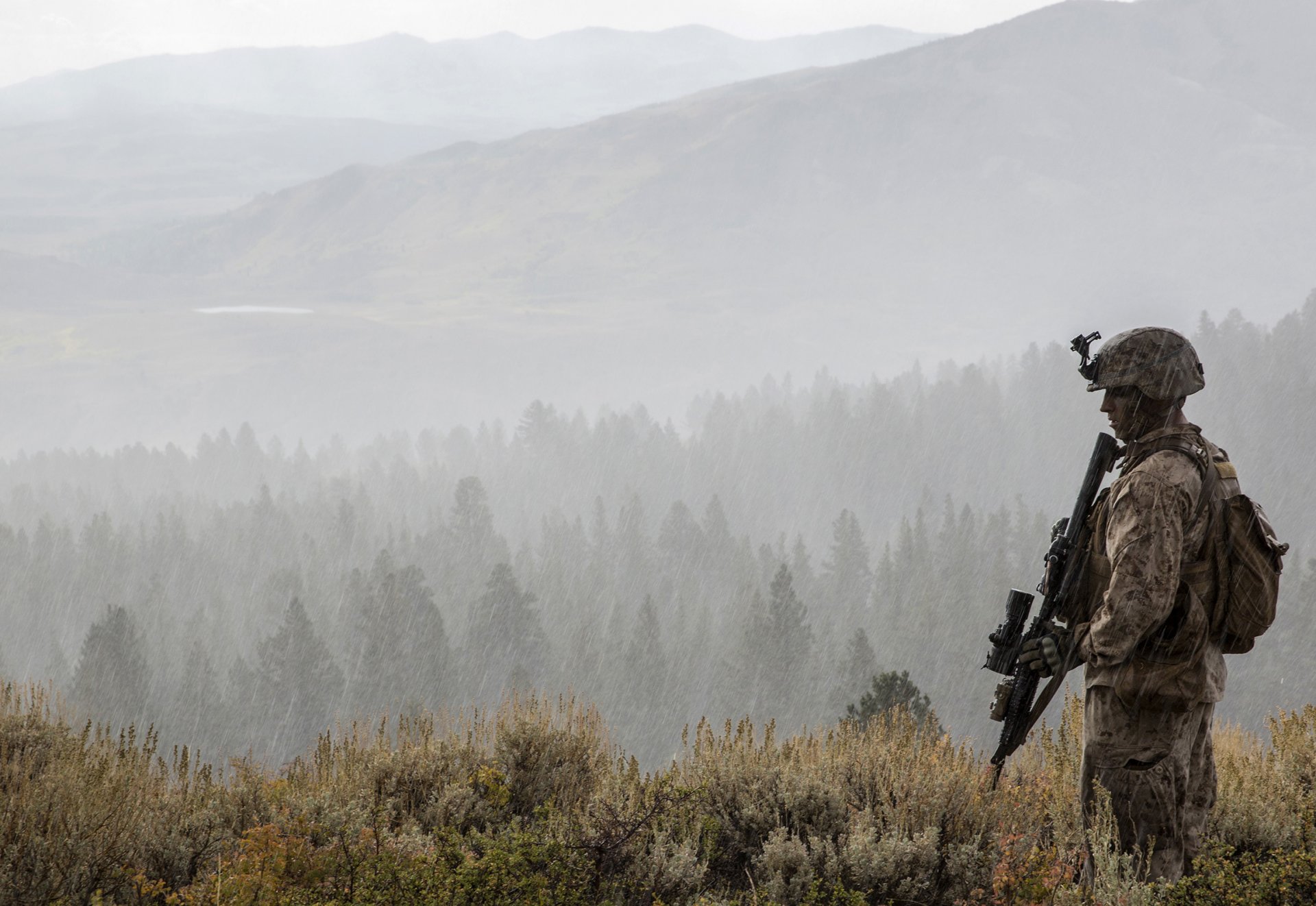 Ein Soldat in einer Gasmaske schießt aus einer Waffe