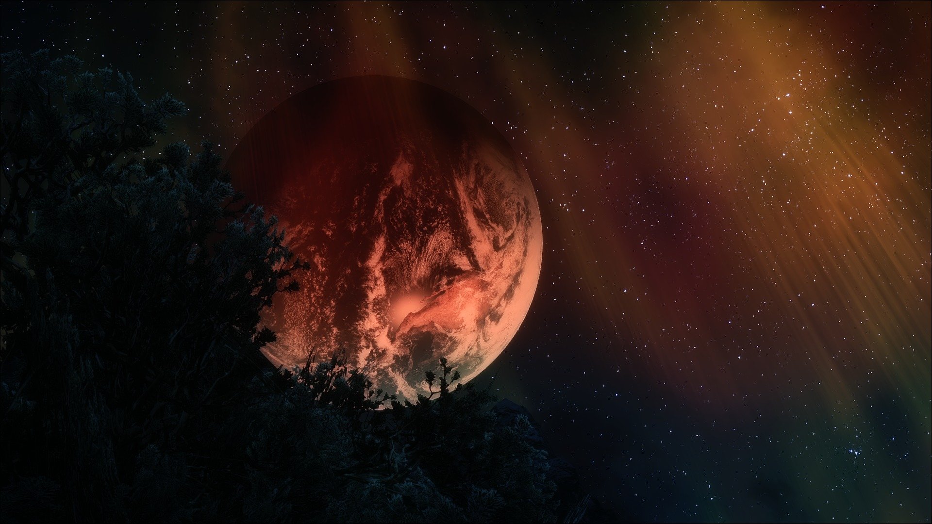 Ein Planet im Weltraum in dunkelroter Beleuchtung
