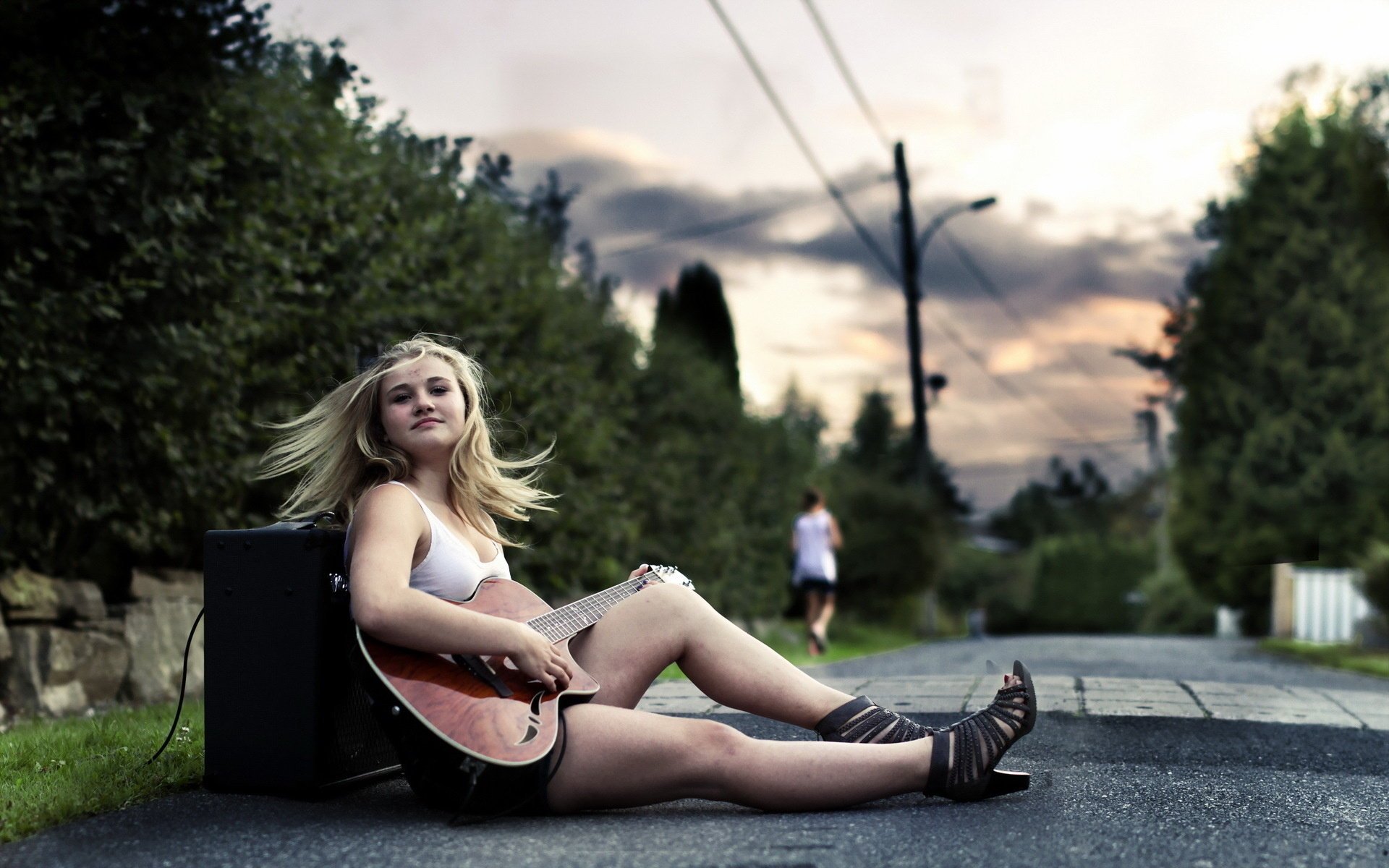 Mädchen mit Gitarre sitzt auf dem Asphalt