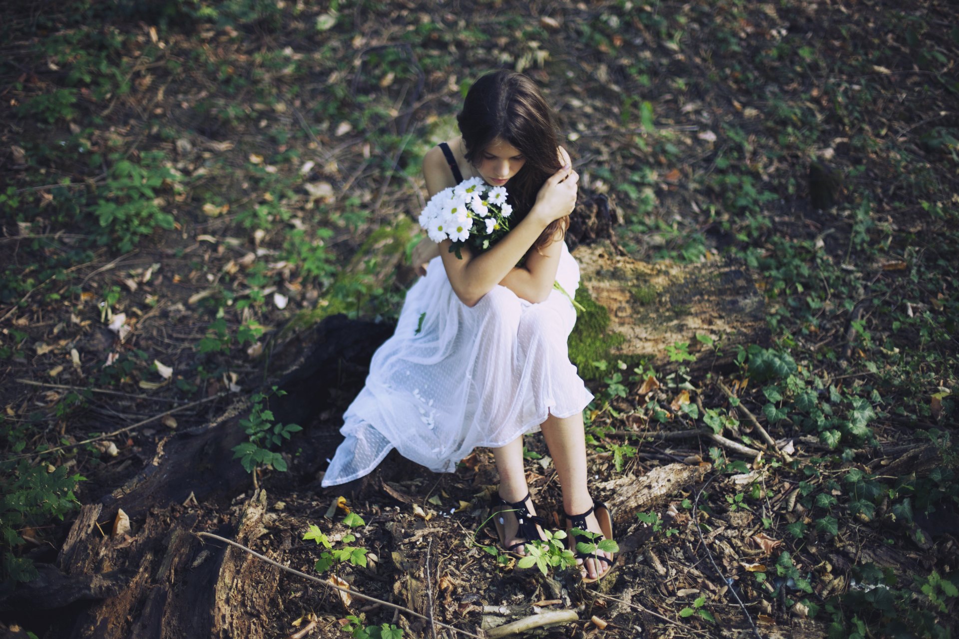 Mädchen im weißen Kleid im Wald