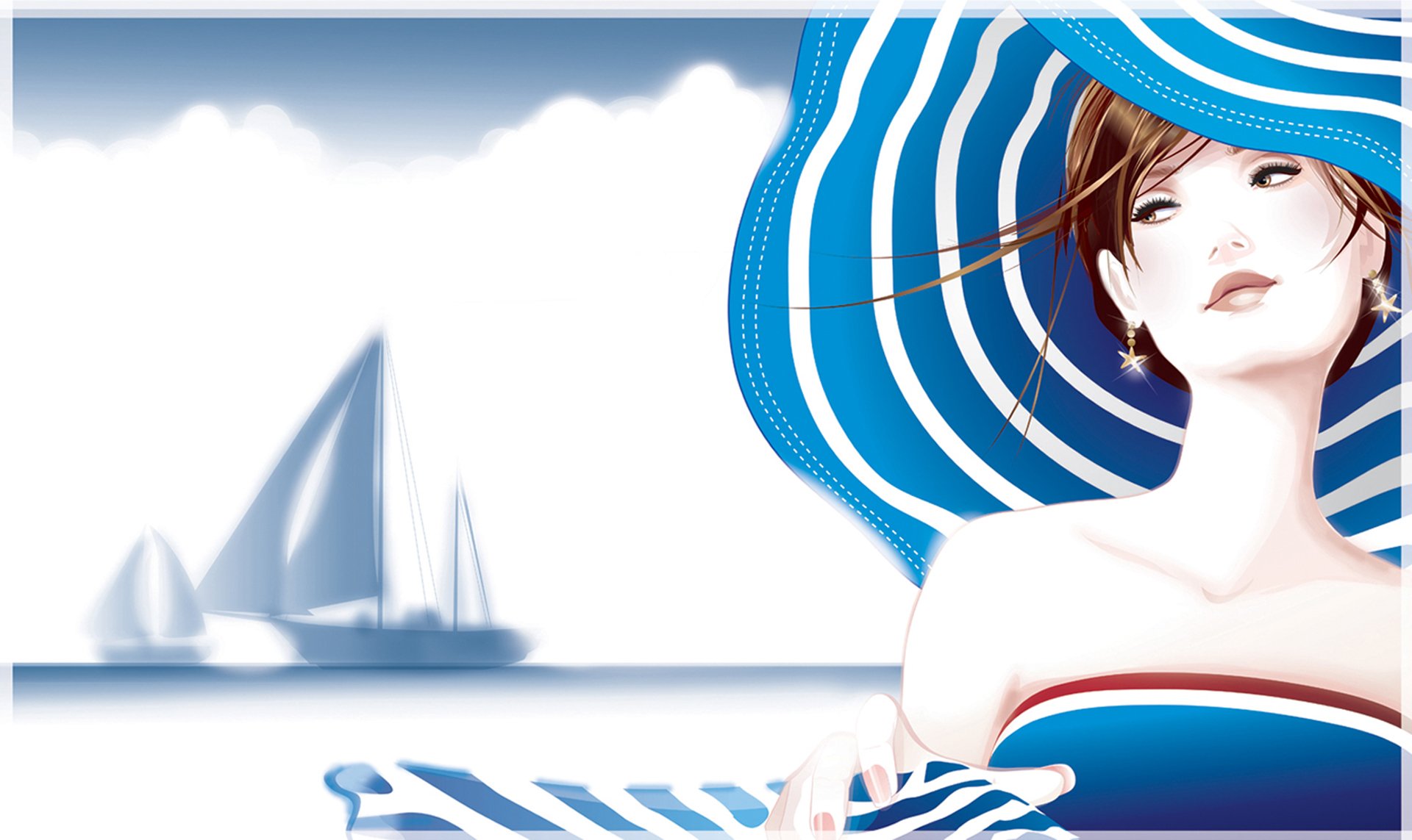 Mädchen mit Hut mit dem Rücken zum Segelboot