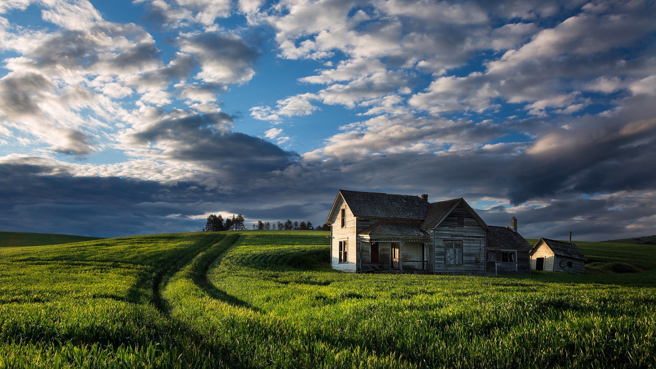 Schöne Aussicht auf das Feld mit Häusern. Himmel mit üppigen Wolken