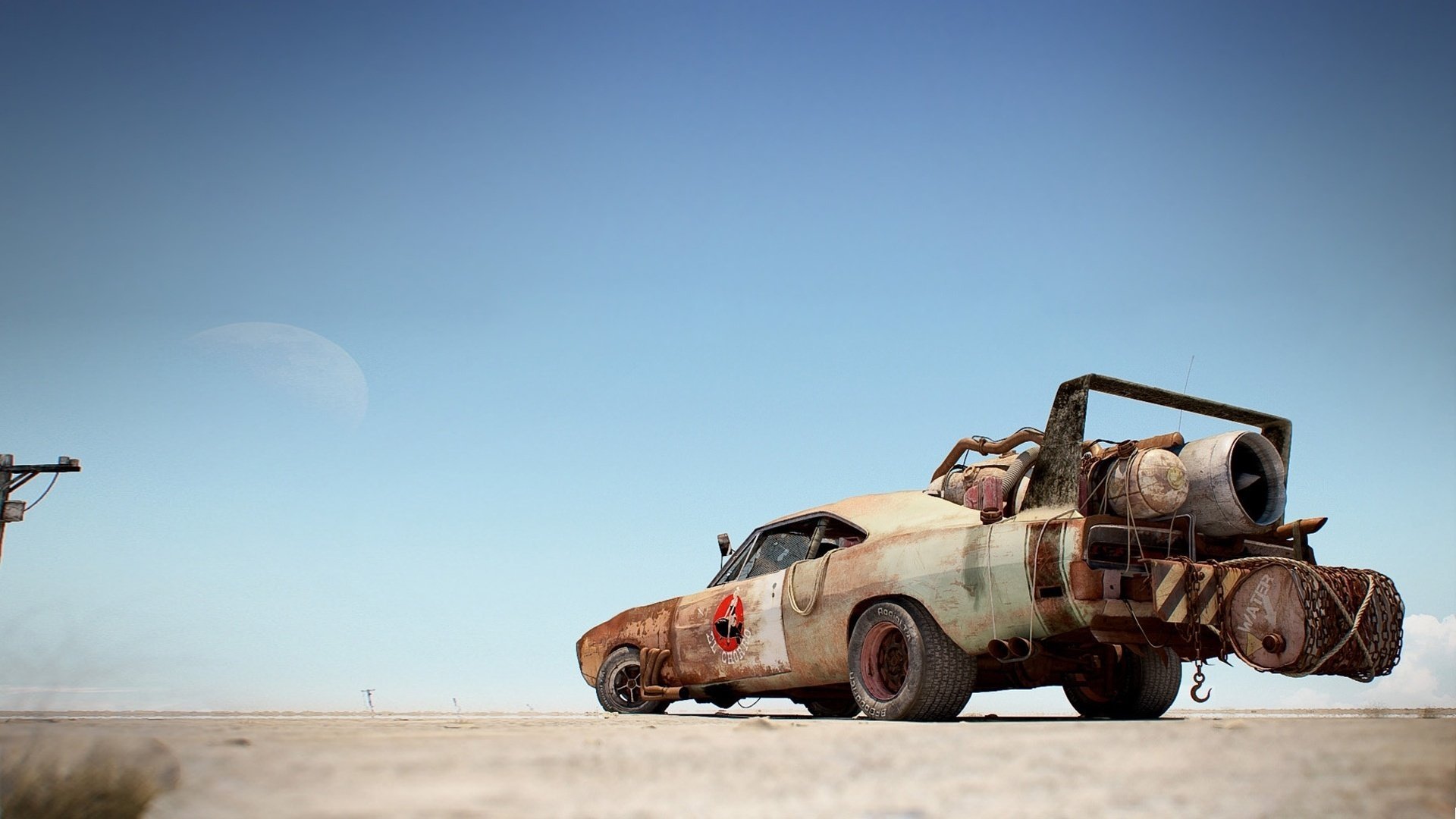 Blauer Dodge fliegt die Strecke vor dem Hintergrund des Feldes entlang